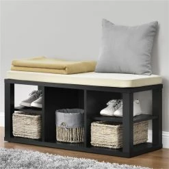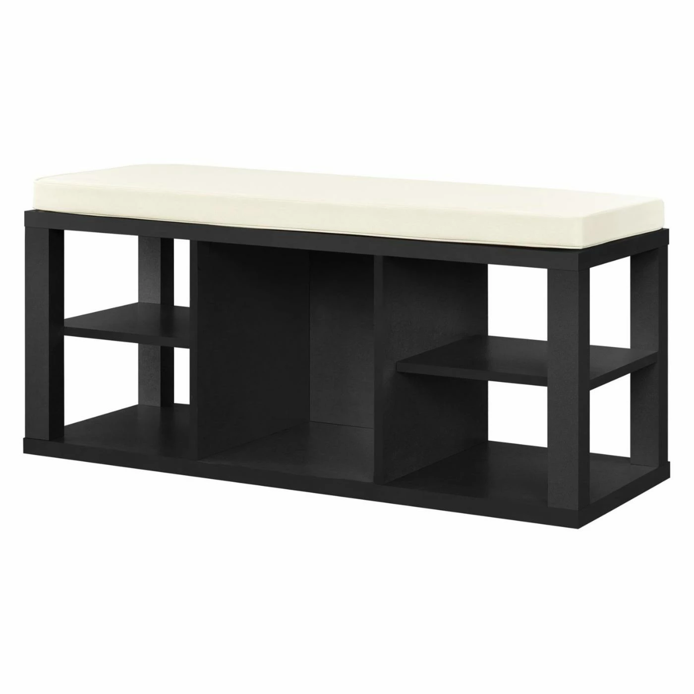 Add the Ameriwood Home Parsons Storage Bench to your entryway, mud room, or any space needing storage and seating. For comfort, this bench is topped with an off-white polyester foam cushion. The sturdy laminated particleboard frame is offered in a choice of finishes. Five open shelves offer room for display pieces, storage baskets, or shoes.