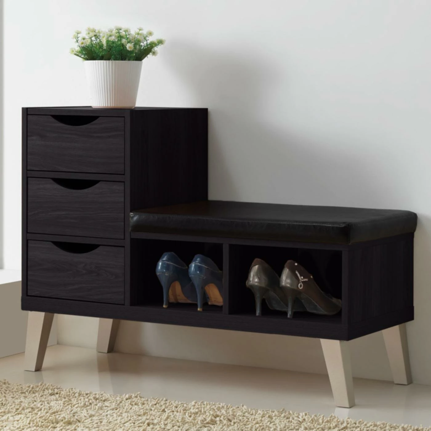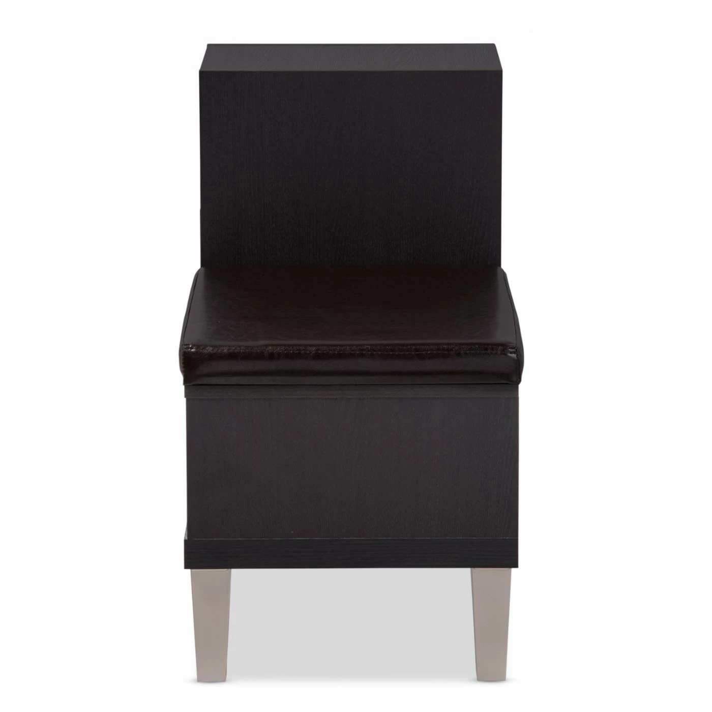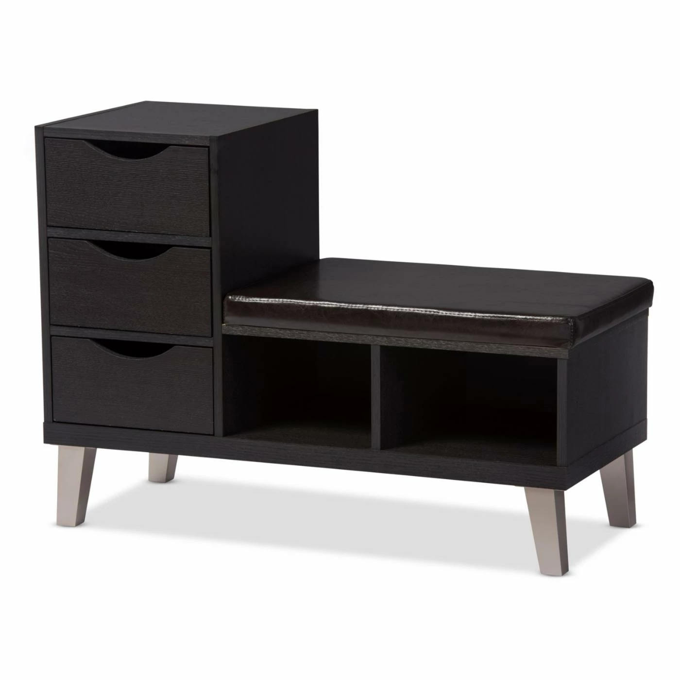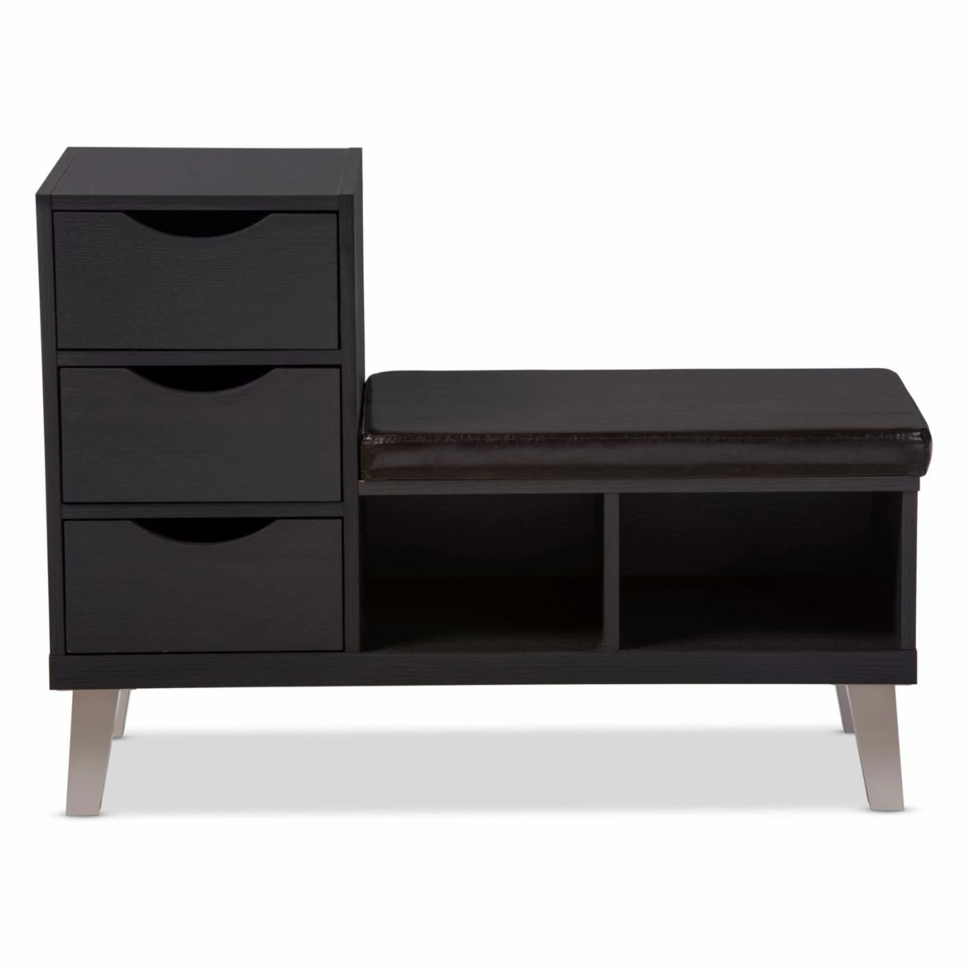 A dapper darling, the Baxton Studio Arielle Seating Bench with Shoe Storage and Drawers is at home in your entryway, bedroom, or anywhere needed added storage and style. Its mid-century design includes clean lines, a dark brown wood grain finish, and angled legs in a contrasting light finish. Storage lives in the three pull-out drawers with easy open grooves and the two open shelves perfect for shoes. A comfortably padded, faux leather top offers a comfy spot to sit.