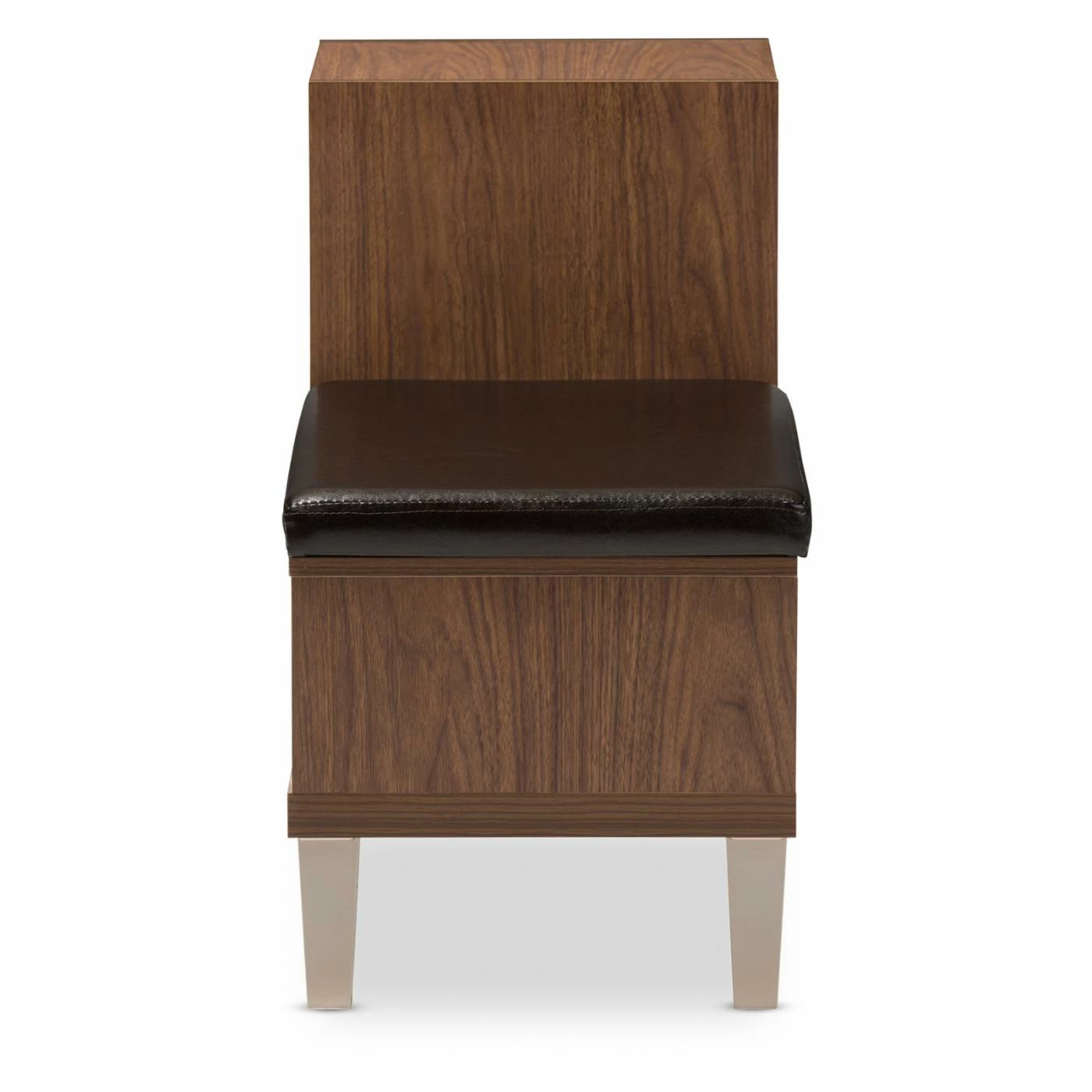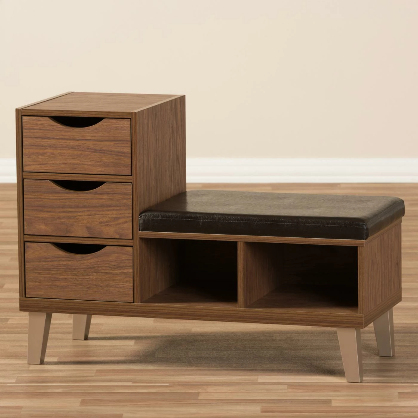 Brilliant in the entryway or your bedroom, this Baxton Studio Arielle Shoe Storage Bench offers enclosed and open storage plus a stylish spot to sit. This wood and veneers bench comes in walnut brown and is topped with a faux leather seat. Three notched side drawers and two open shoe cubbies offer storage galore.