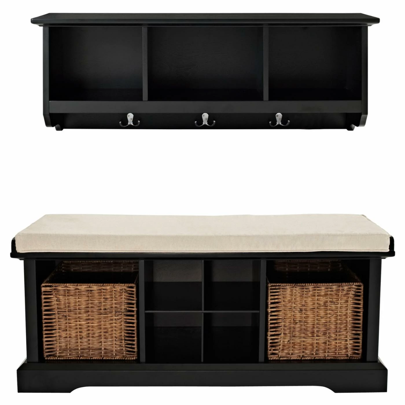 Three double coat hooks offer prime coat-hanging space, and the shelf-top makes for a perfect place to store even more or display pictures or favorite pieces. Conveniently, the full-size bench cushion offers up a comfortable spot for putting on or taking off shoes. Made of solid hardwood and veneer construction and finished in sleek black, this storage combo is durable and beautiful.