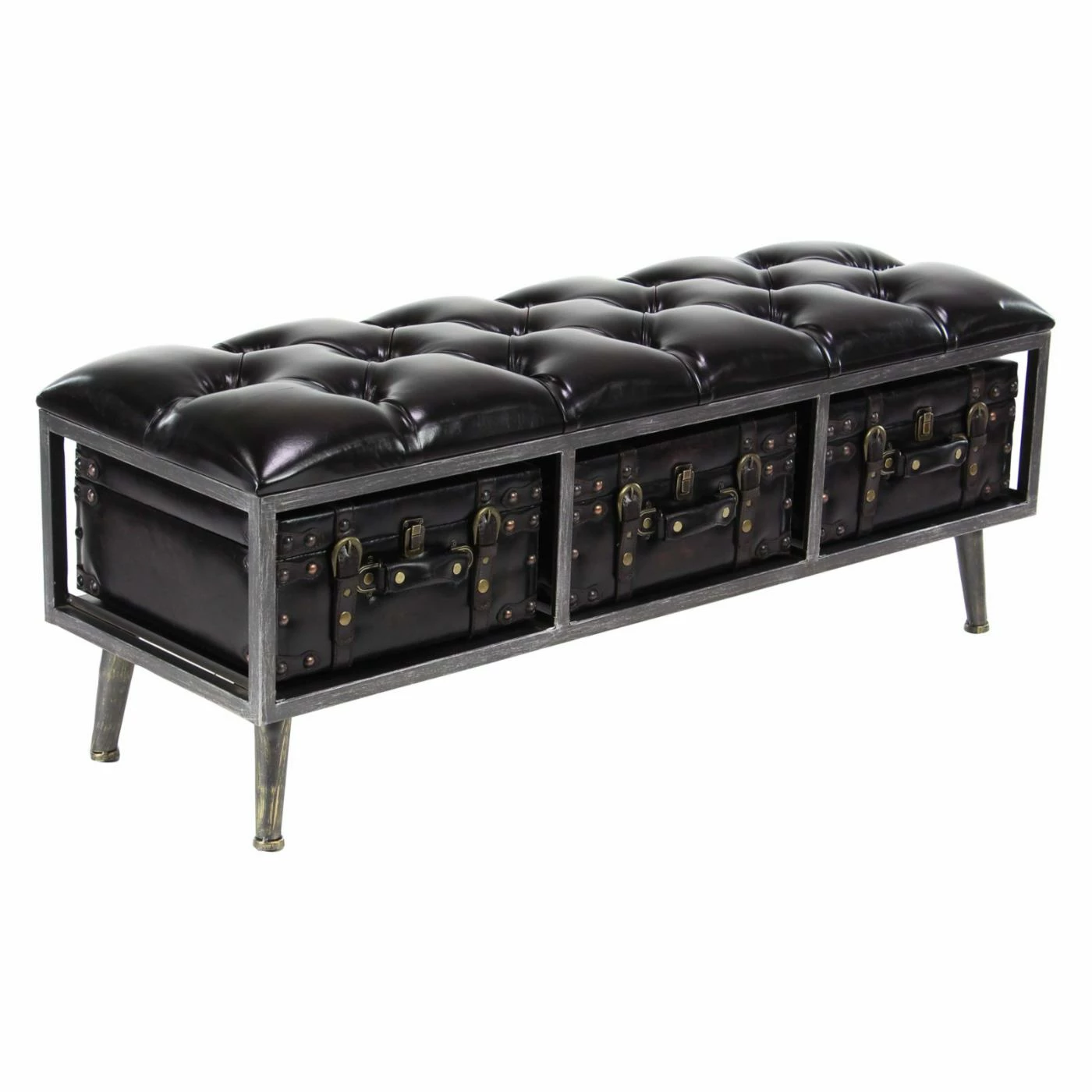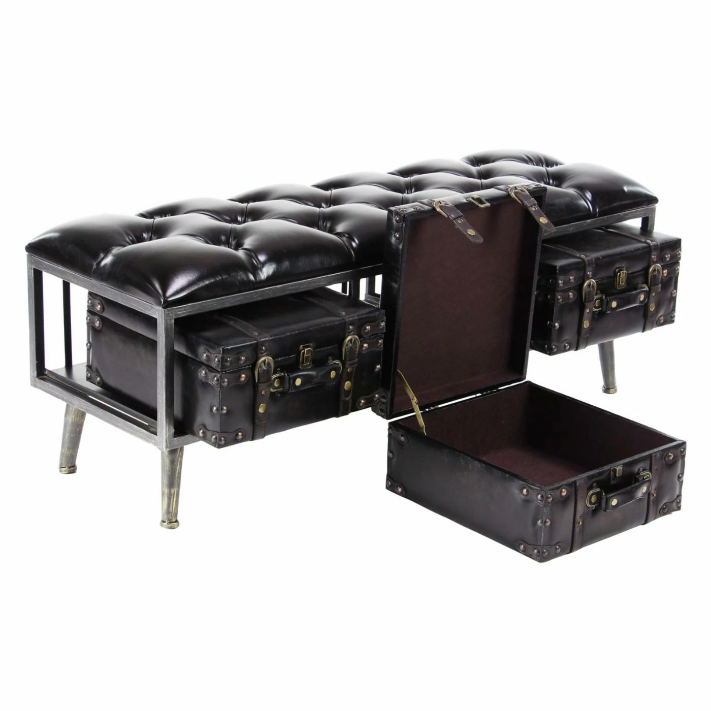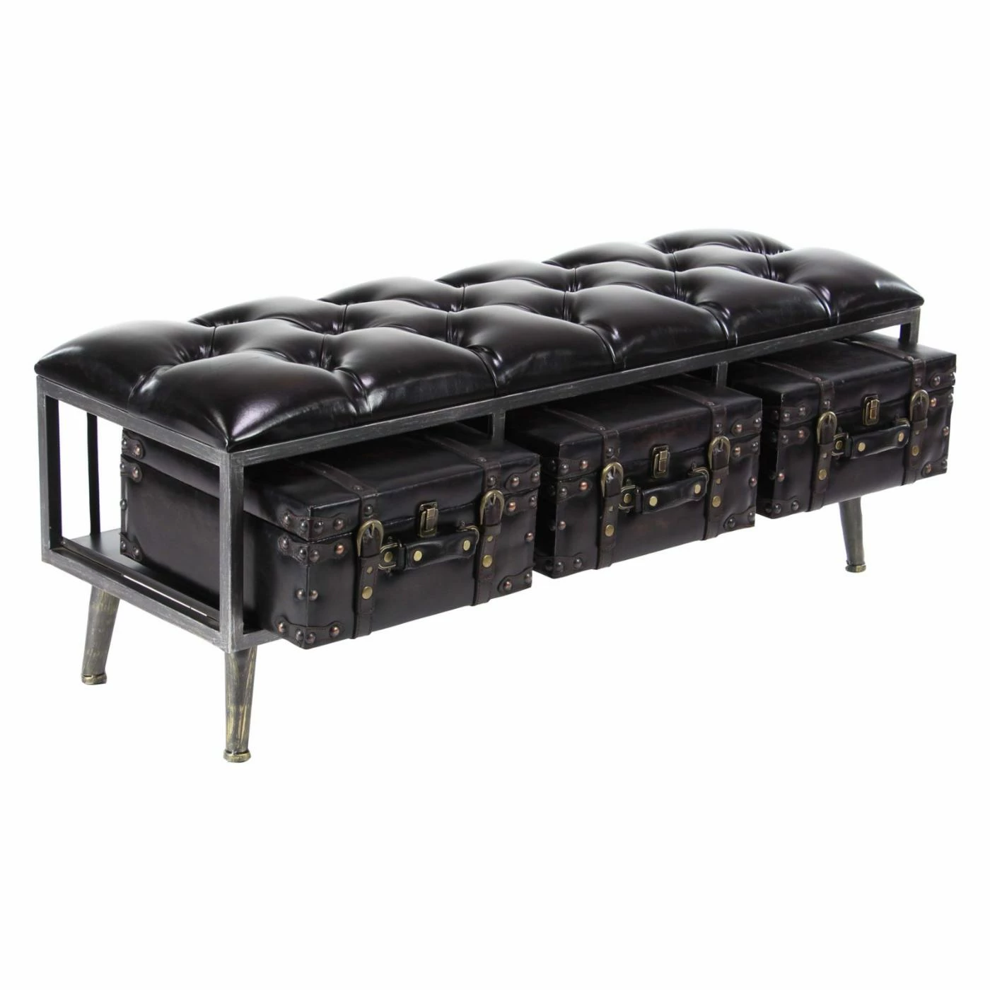 Add a vintage note to your living space with the DecMode Tufted Leather-Covered Rectangular Wooden Storage Bench with 3 Suitcases. Constructed from pine wood, this storage bench is covered in tufted leather upholstery. It includes three suitcases, which are ideal for keeping household items safely stowed.