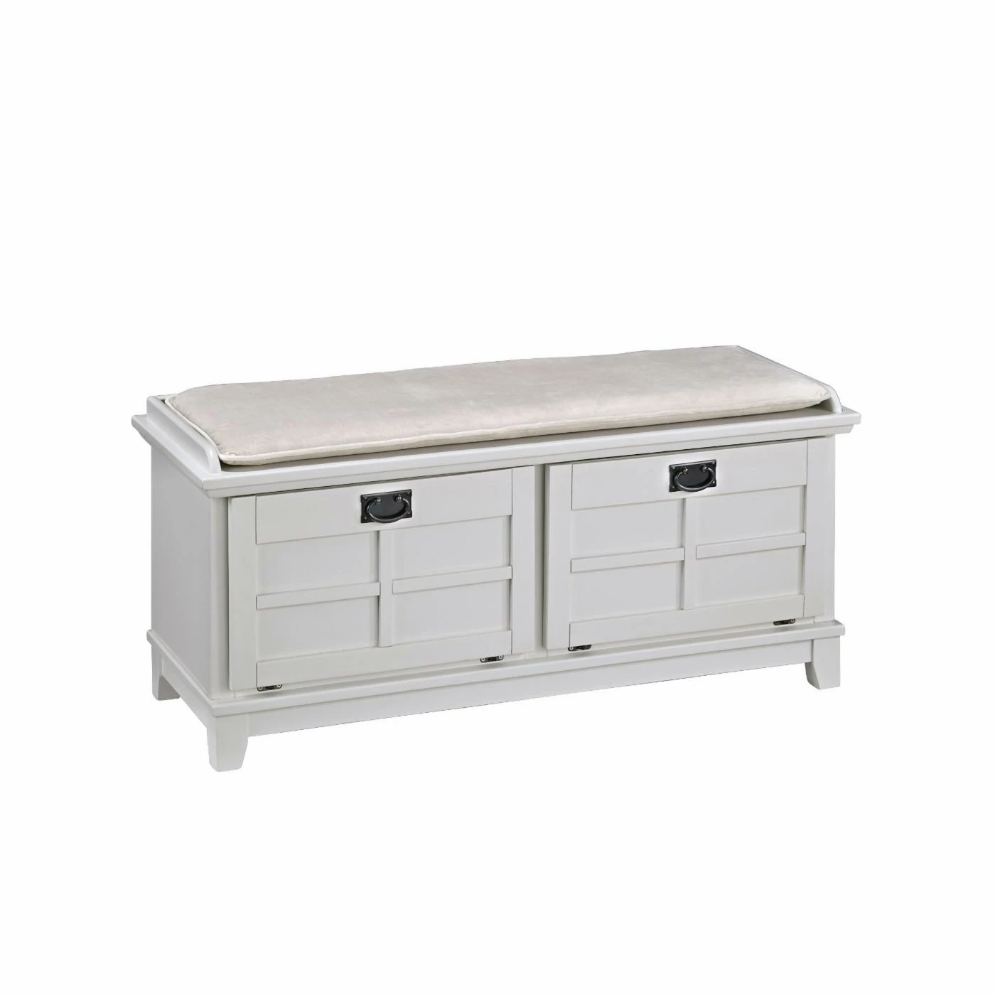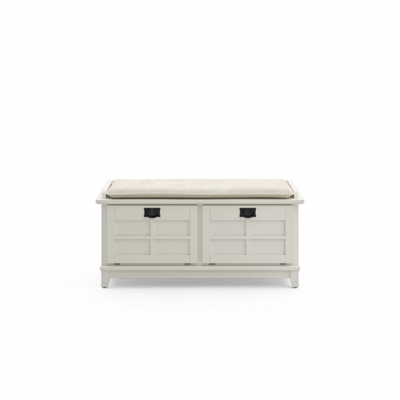 The Home Styles Arts & Crafts Upholstered Storage Bench offers Mission styling at its best! The Arts & Crafts movement was all about casual elegance and built-in storage, which makes this upholstered bench a natural. Its embellishments are typical of Mission style with framed doors showcasing raised wood, lattice moldings, and slightly flared legs. This bench is constructed of ash solids and veneers in your choice of finish. Features include a padded, neutural-colored ultra-suede cushion that’s removable and reversible for practicality. Dual drop-down storage doors with black matte hardware pulls complete the Mission style. At 47.25 inches wide, 18 inches deep, and 21 inches tall, this bench is just right for your space.