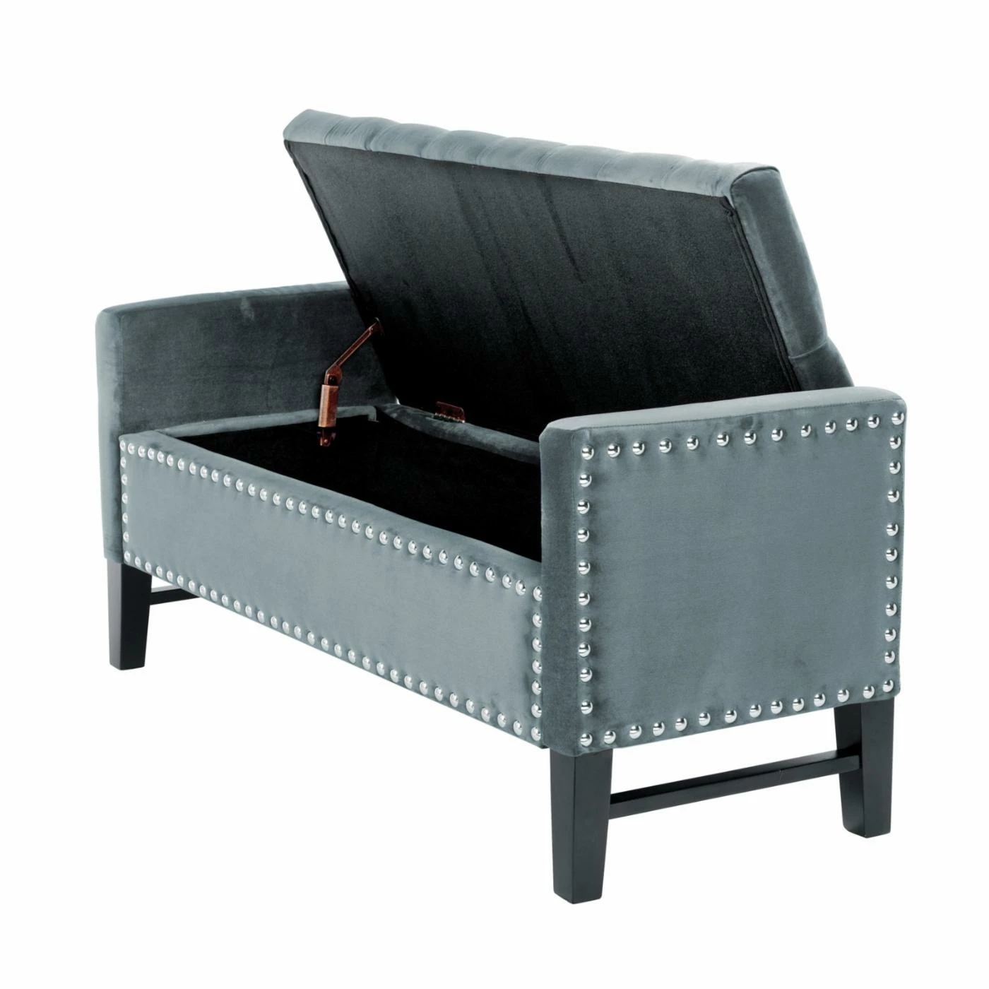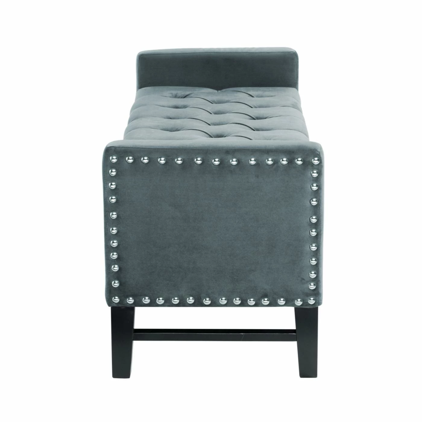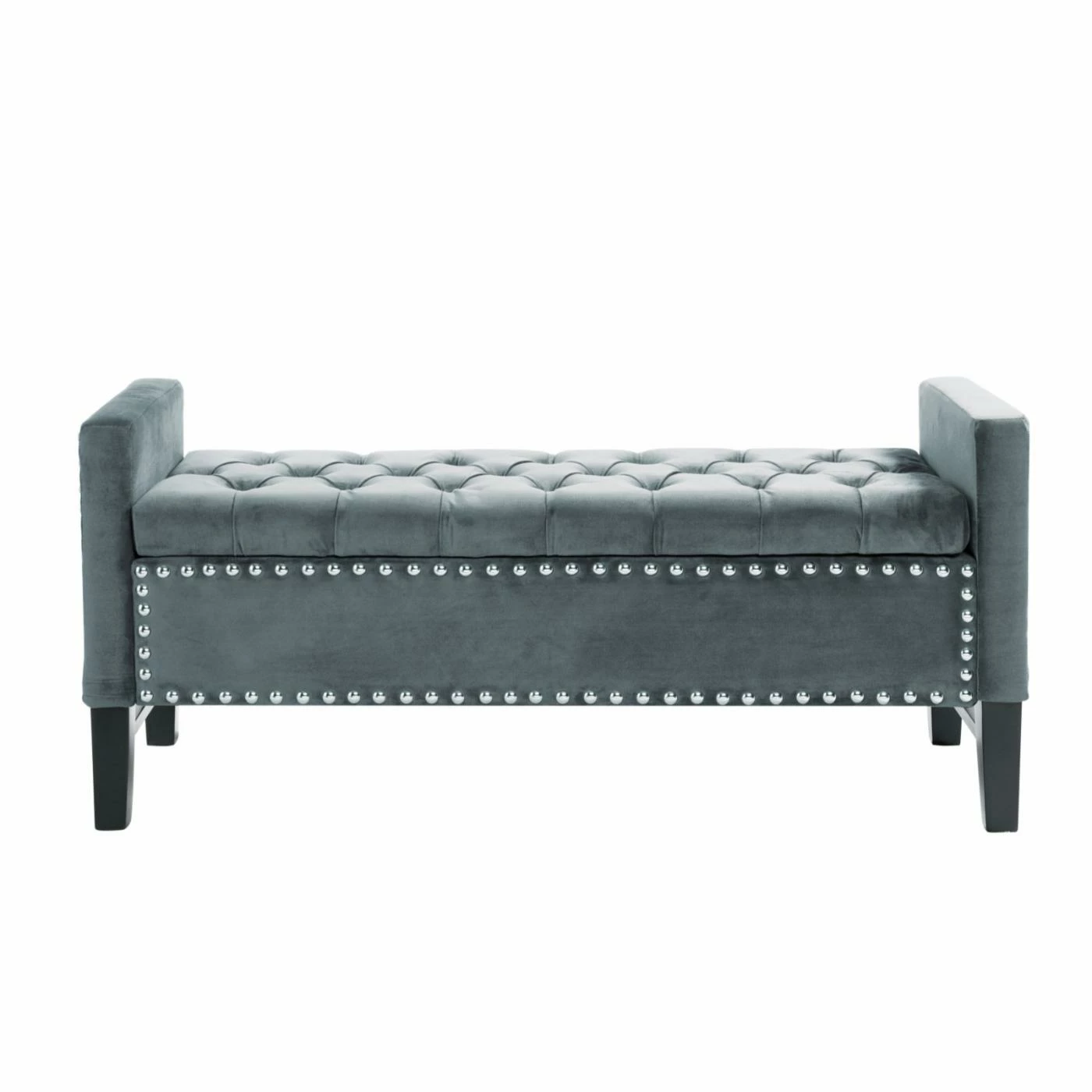 Complete your living room or bedroom with the Inspired Home Hadley Velvet Button Tufted Indoor Storage Bench. This long bench features arms on the ends and a nailhead trim that calls attention to the clean, contemporary style lines. The comfortable, button tufted seat is hinged, opening to reveal ample storage space inside.