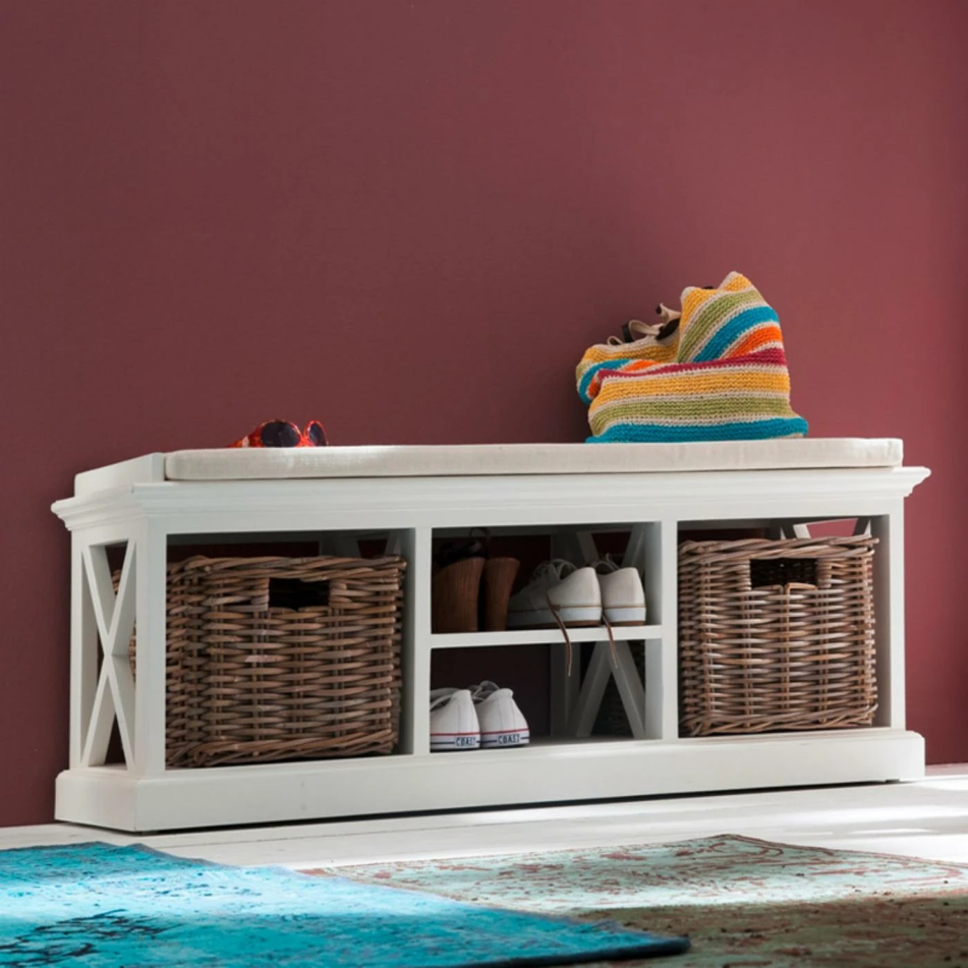 A brilliant entryway solution, this Nova Solo Halifax Bench and Basket Set with Seat Cushion offers storage, seating, and style. Classic lines include X side details and a top rail all crafted of solid mahogany and composite wood in a country fresh white finish. A white cotton seat cushion offers comfortable seating and a shelf below provides two levels of shoe storage. Handsome rattan baskets allow you to tuck away all sorts of items.