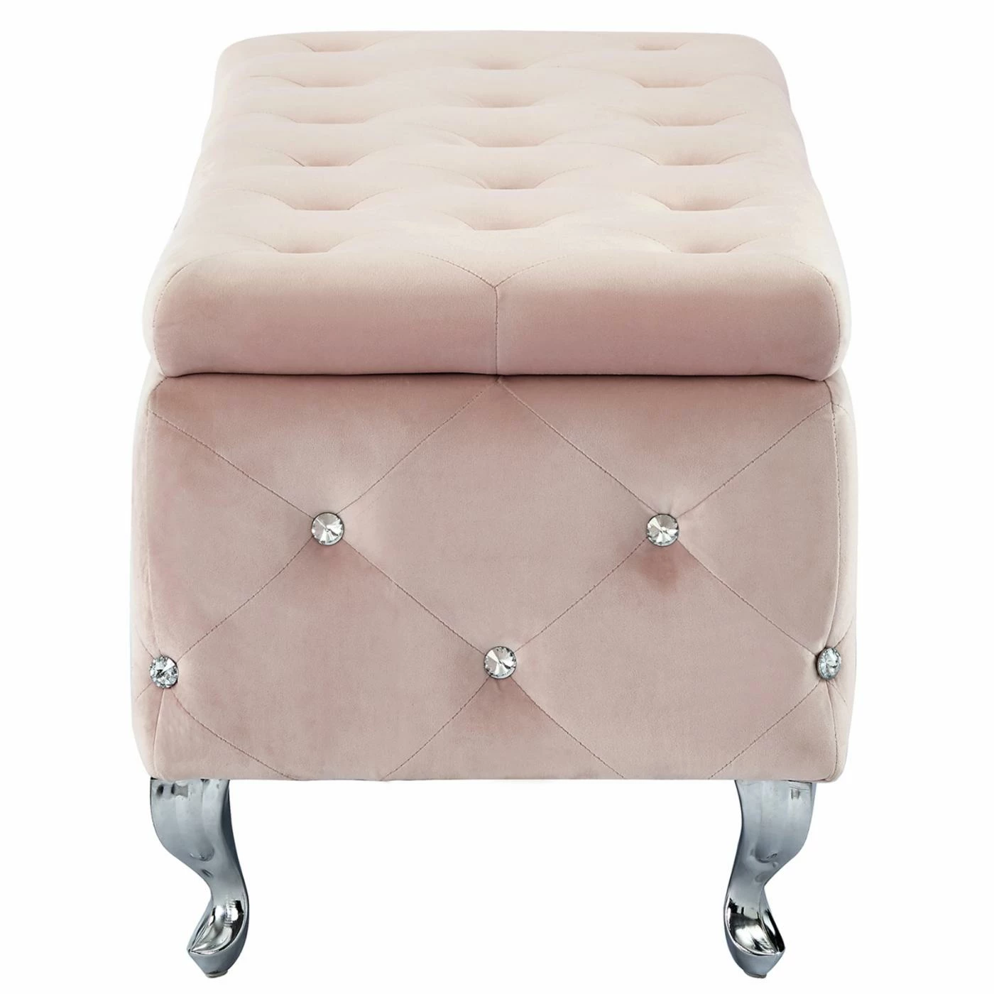 The !nspire Velvet Storage Bench with Crystals adds a chic touch to any room, with its soft blush pink velvet upholstery. Diamond-patterned stitching and crystal button tufting add further elegance to this piece. This bench opens to reveal deep storage, perfect for placing pillows or blankets. Cabriole-style legs in a chrome finish add a polished touch to this bench.