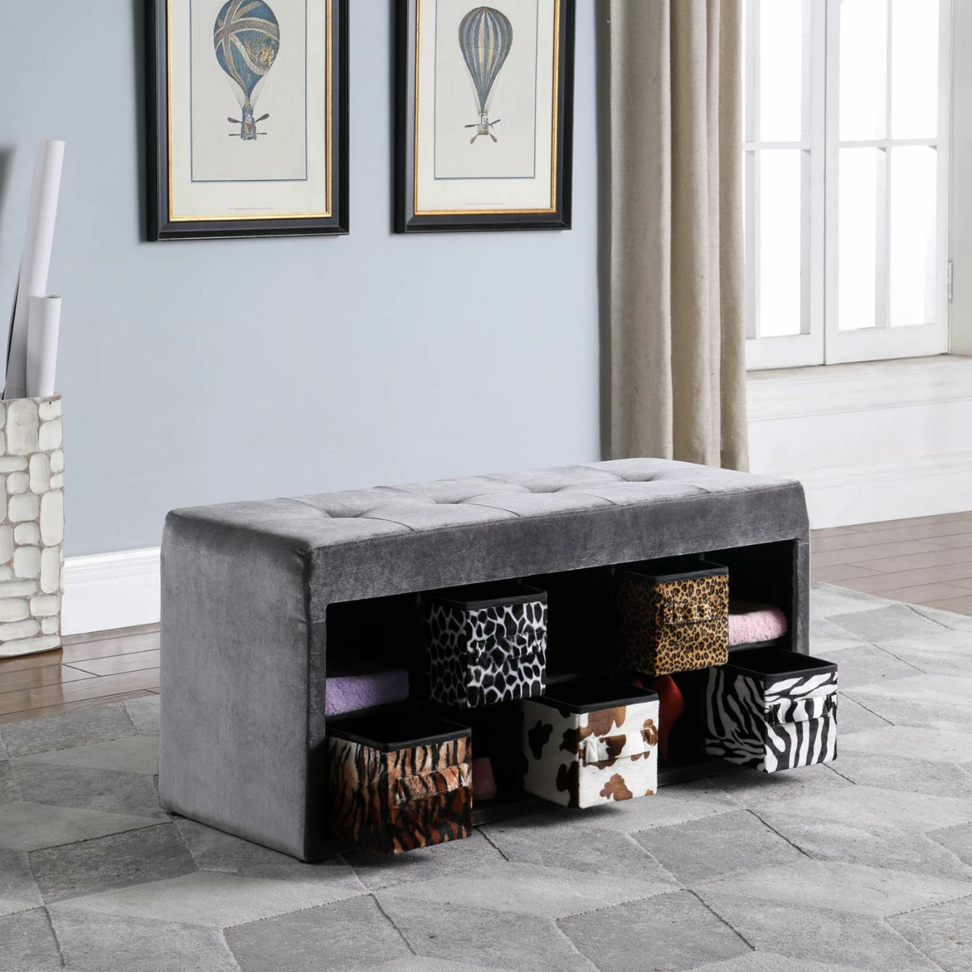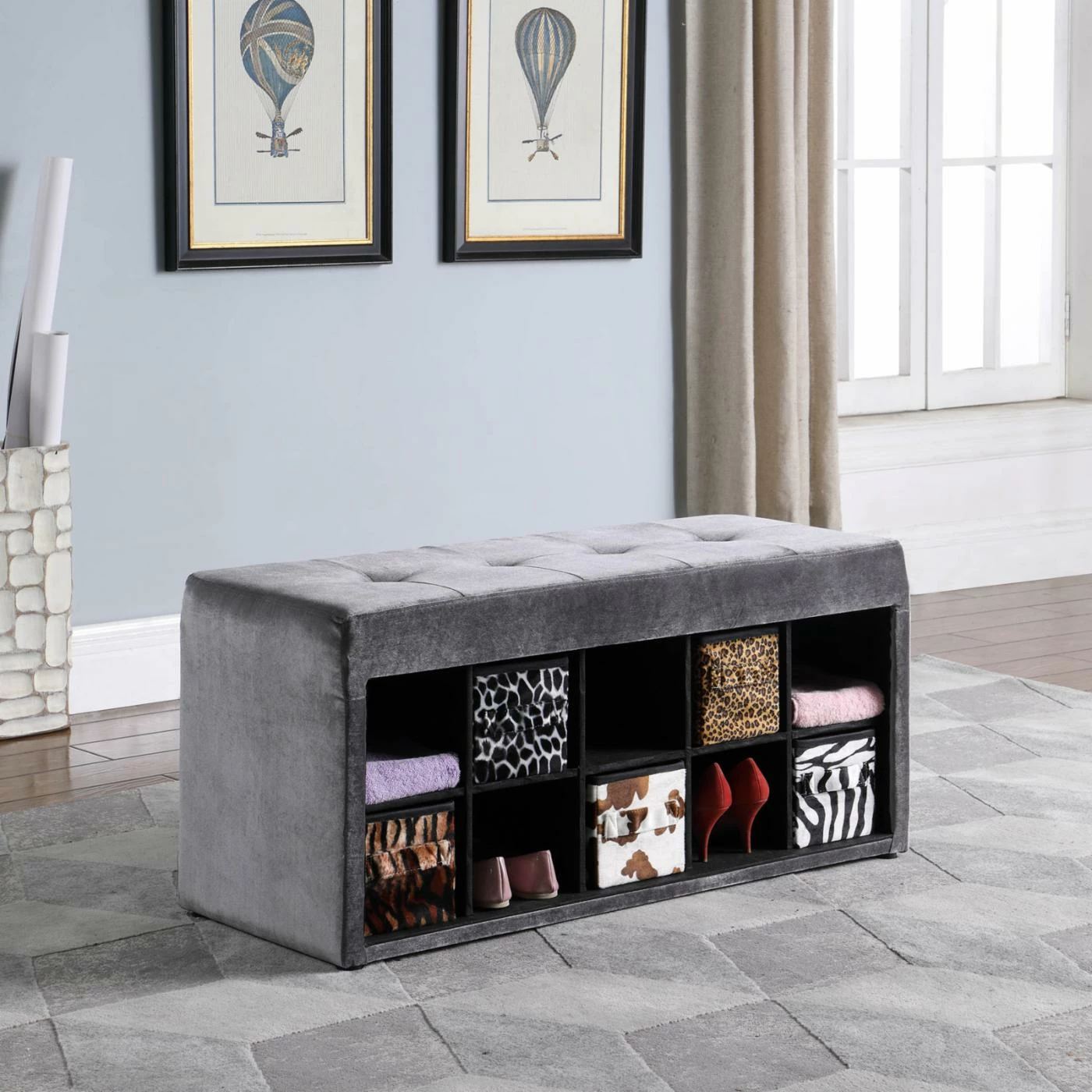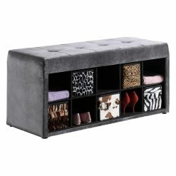 Place the Ore International Devin Velour Tufted Storage Bench in your home for a chic and stylish storage solution. This stylish cubby is upholstered in an easy-care polyester velour, in a rich gray color. The light foam fill under the velour adds soft cushion to the seat, which is elevated with quilted button tufting. The ten small cubby holes come with five animal print fabric baskets, from stripes to spots. Place small items like towels, knick knacks, or shoes in each space. This double-function bench is a great fit for homes looking for additional storage, as well as a room that needs a little extra seating. For your convenience, this bench arrives fully assembled.