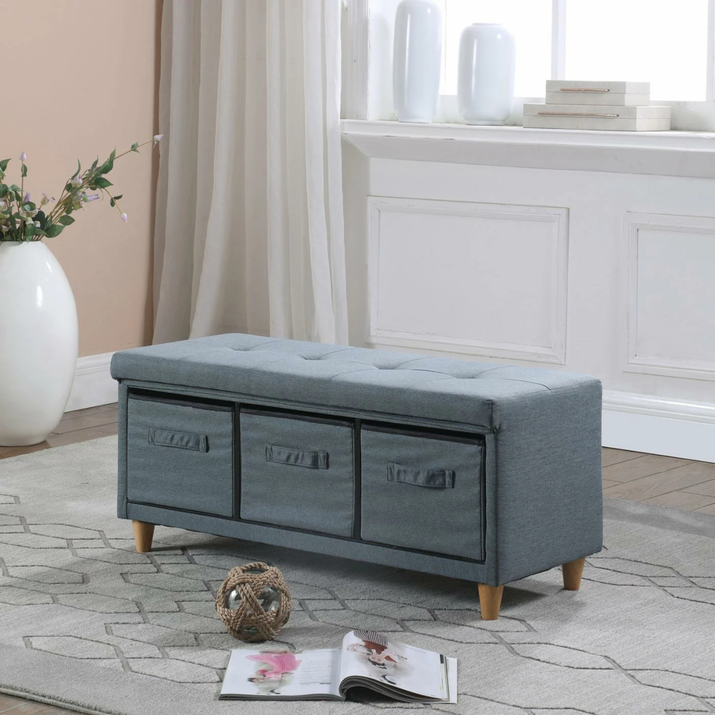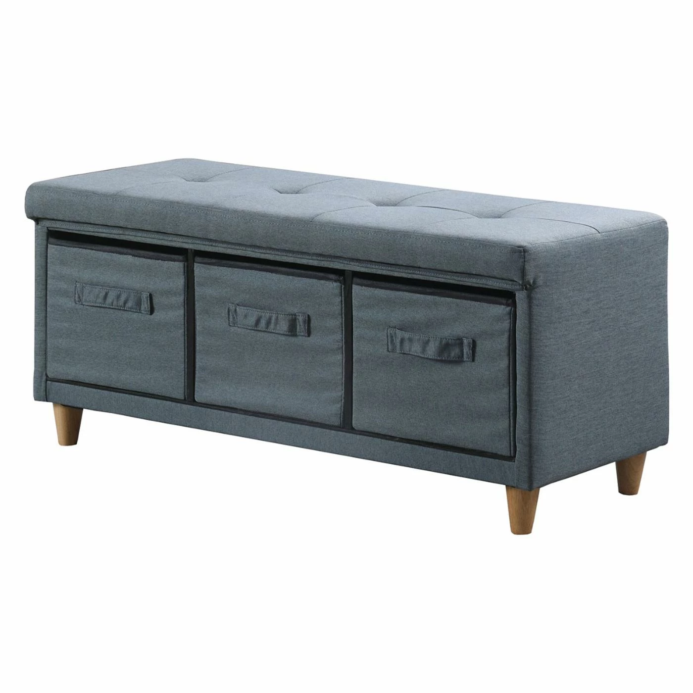 Whether you’re looking for extra seating or extra storage, the Ore International Magnolia Tufted Storage Bench has you covered. This storage bench is upholstered in a slate blue cotton polyester blend that’s easy to style and easy to care for. A light foam fill creates cushion on the seat of this bench, as well as contrast for the quilted tufting detail. Cone shaped spindle legs in a light wooden finish lend a Scandinavian inspired influence to this look. The three cloth storage baskets are easy to remove and fill with your favorite items, from toys to shoes. The inside of this bench is a dark black for a chic contrast. For your convenience, this bench arrives fully assembled.