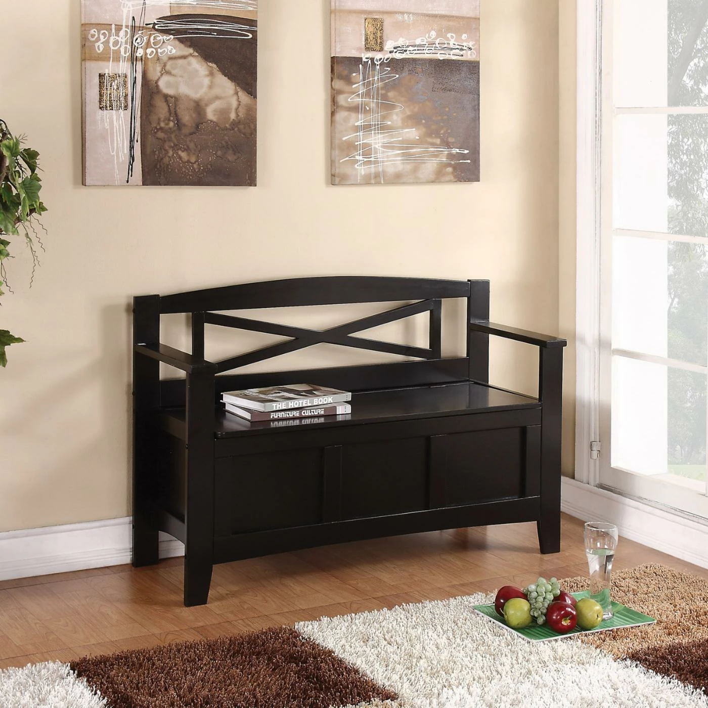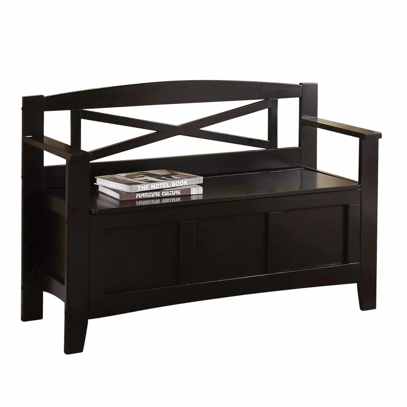 The OSP Home Furnishings Metro Modern Entry Way Bench serves as a convenient storage solution for your home, as well as a place to sit. This bench boasts solid wood and engineered craftsmanship. The seat also flips up to reveal a convenient storage slot for shoes, books, toys, and other items. A smooth black finish gives this bench a clean look.