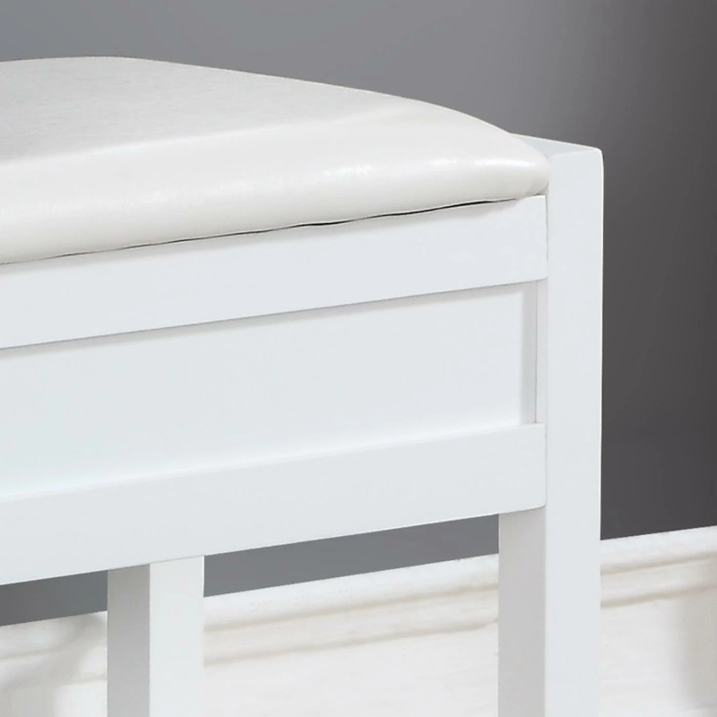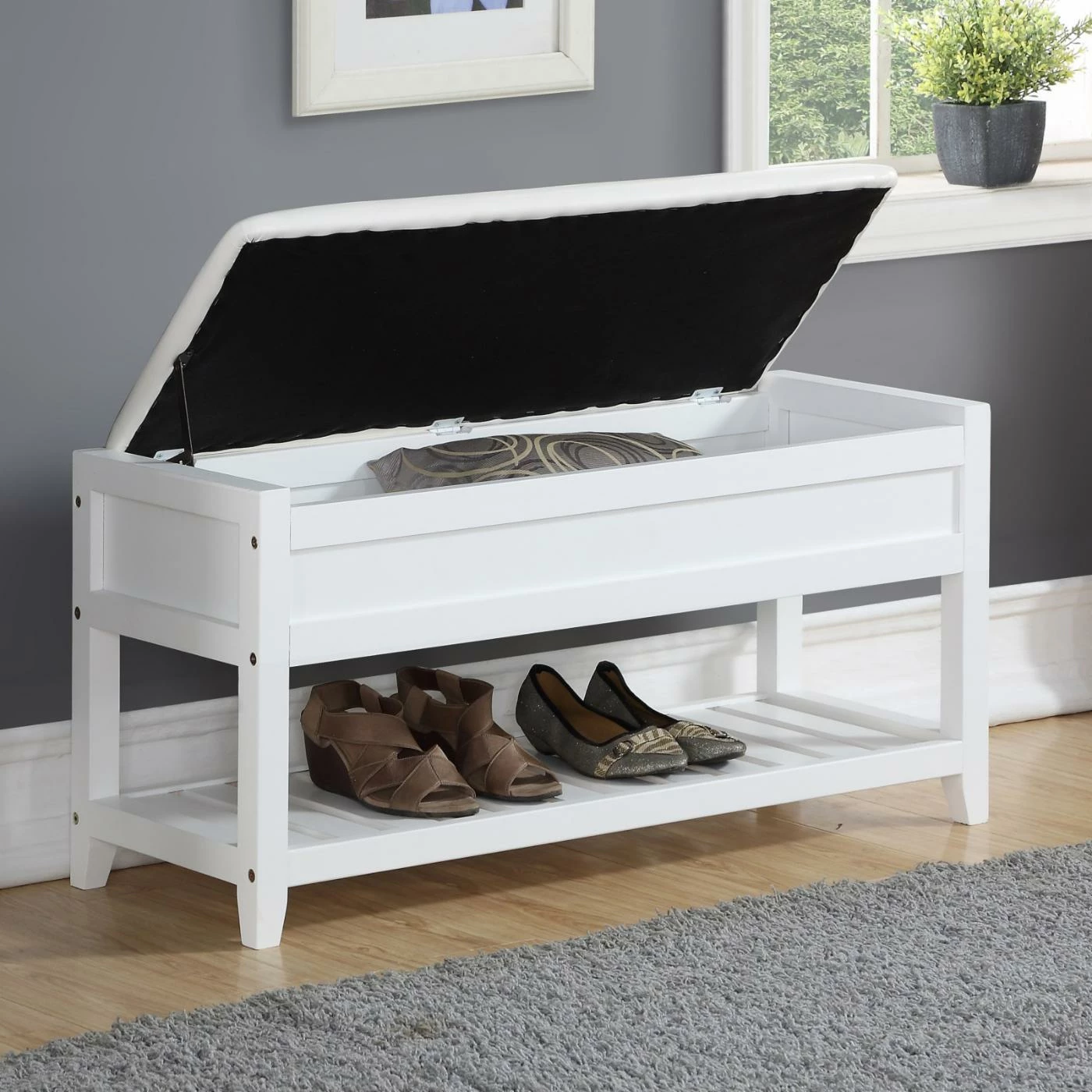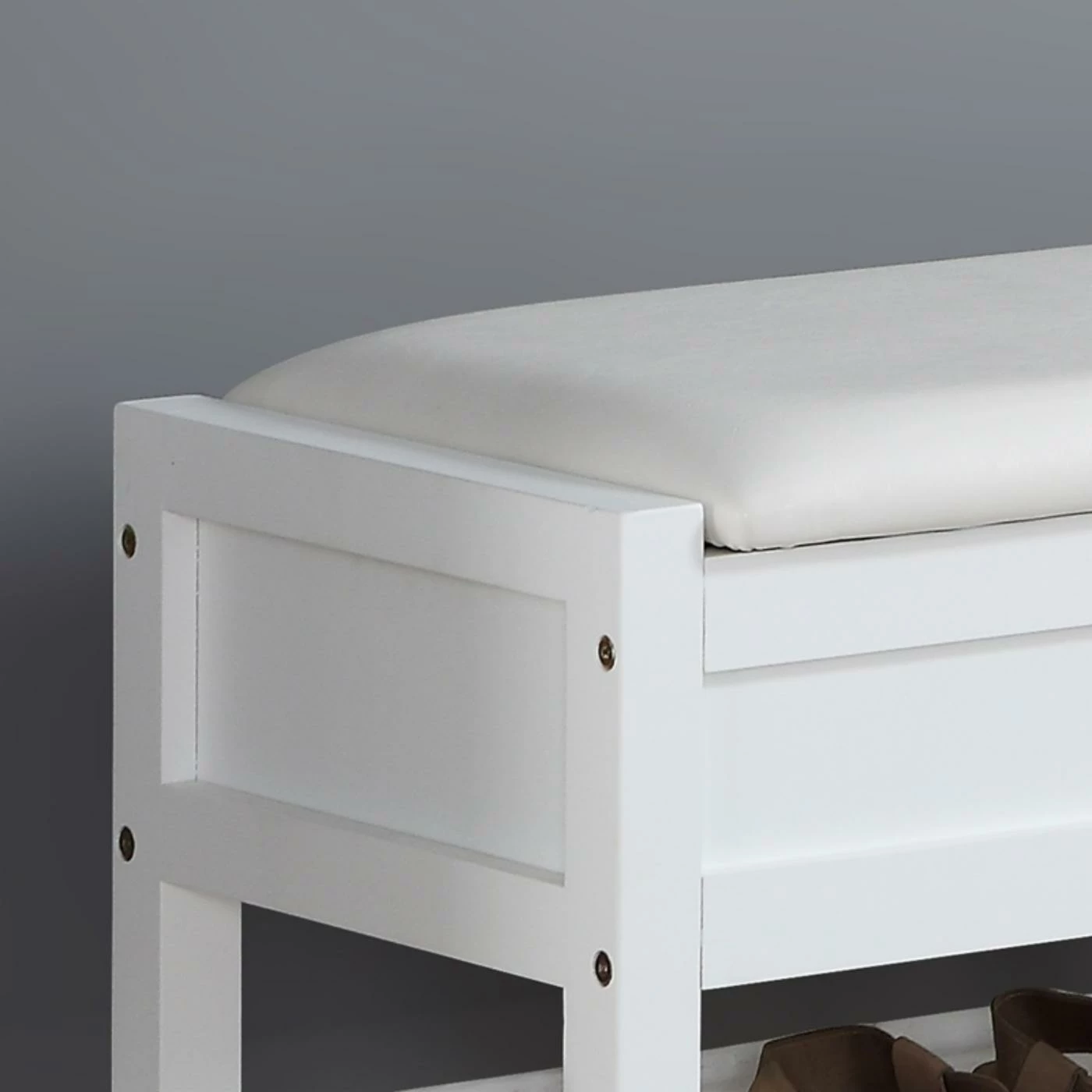 Add the Roundhill Furniture Rouen Faux Leather Upholstered Shoe Storage Bench anywhere you need an updated look and added storage. This attractive bench is made from solid wood and engineered wood for durability, and comes in a crisp white finish that looks great anywhere. The upholstered faux leather seat lifts to reveal a storage compartment. A lower shelf is perfect for keeping shoes off the floor. The simple modern design is the perfect addition to any room.