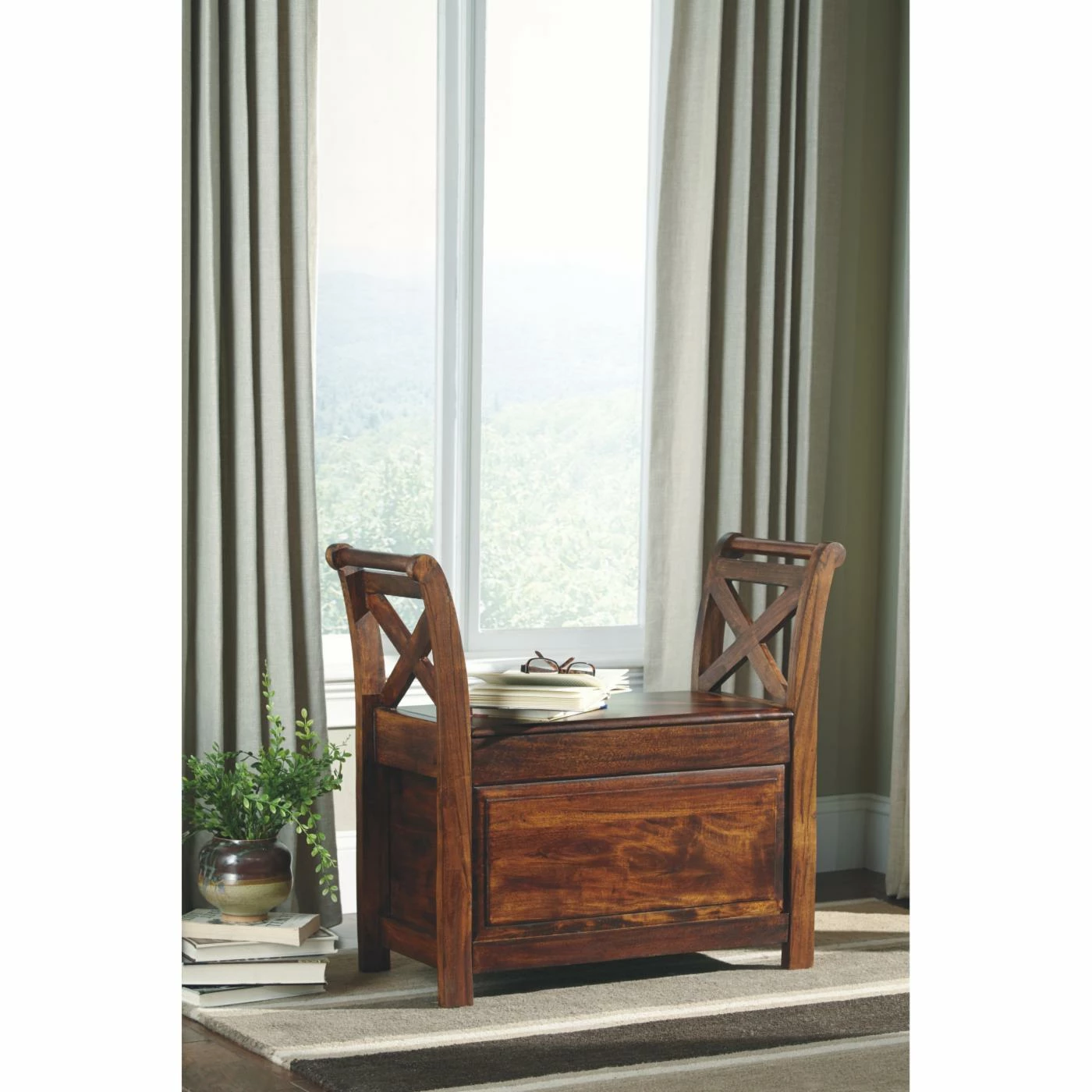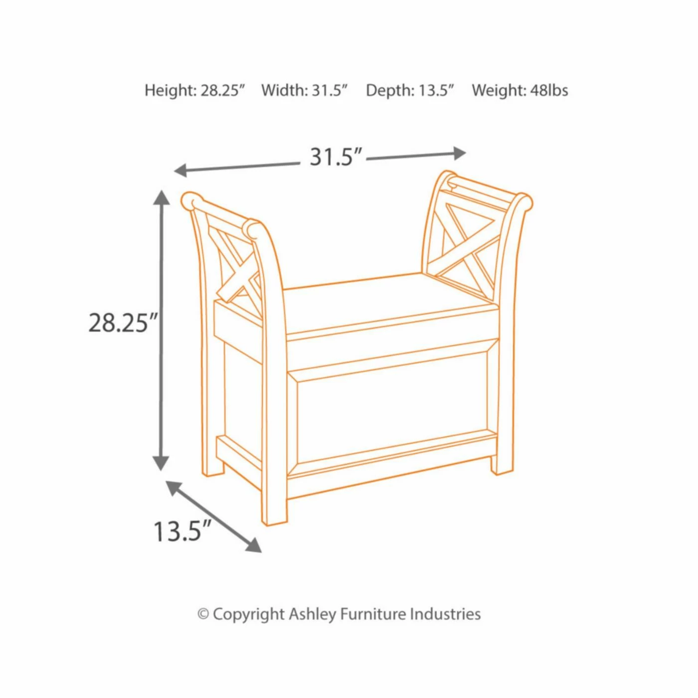 Enjoy the traditional elegance and craftsmanship of the Signature Design by Ashley Abbonto Indoor Storage Bench in any room. Sweeping sides curve with classic X-braces to frame the bench area. Lift up the hinged seat to find a generously sized storage area for items that you want to keep close at hand but out of sight. The sturdy wood construction with a warm natural brown finish coordinates with a wide variety of color schemes.