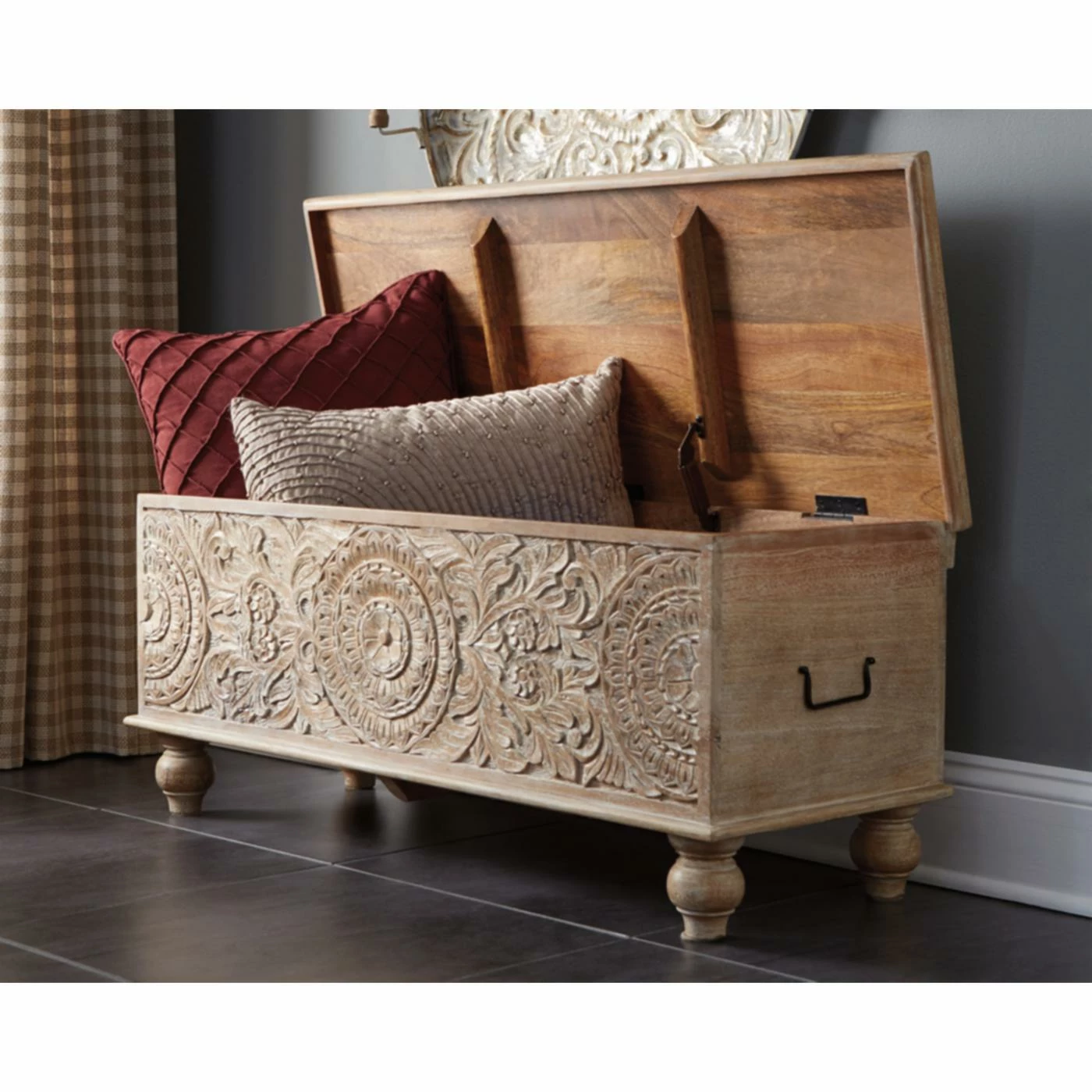Blending classic rustic and global styles together, the Signature Design by Ashley Fossil Ridge 43 in. Backless Wood Storage Bench is a bold, functional addition to your home. This sturdy backless bench includes metal handles on the sides, turned legs, and carved detailing featuring floral and medallion motifs. The seat lifts up to reveal roomy hidden storage for throw blankets, pillows, and other essentials.