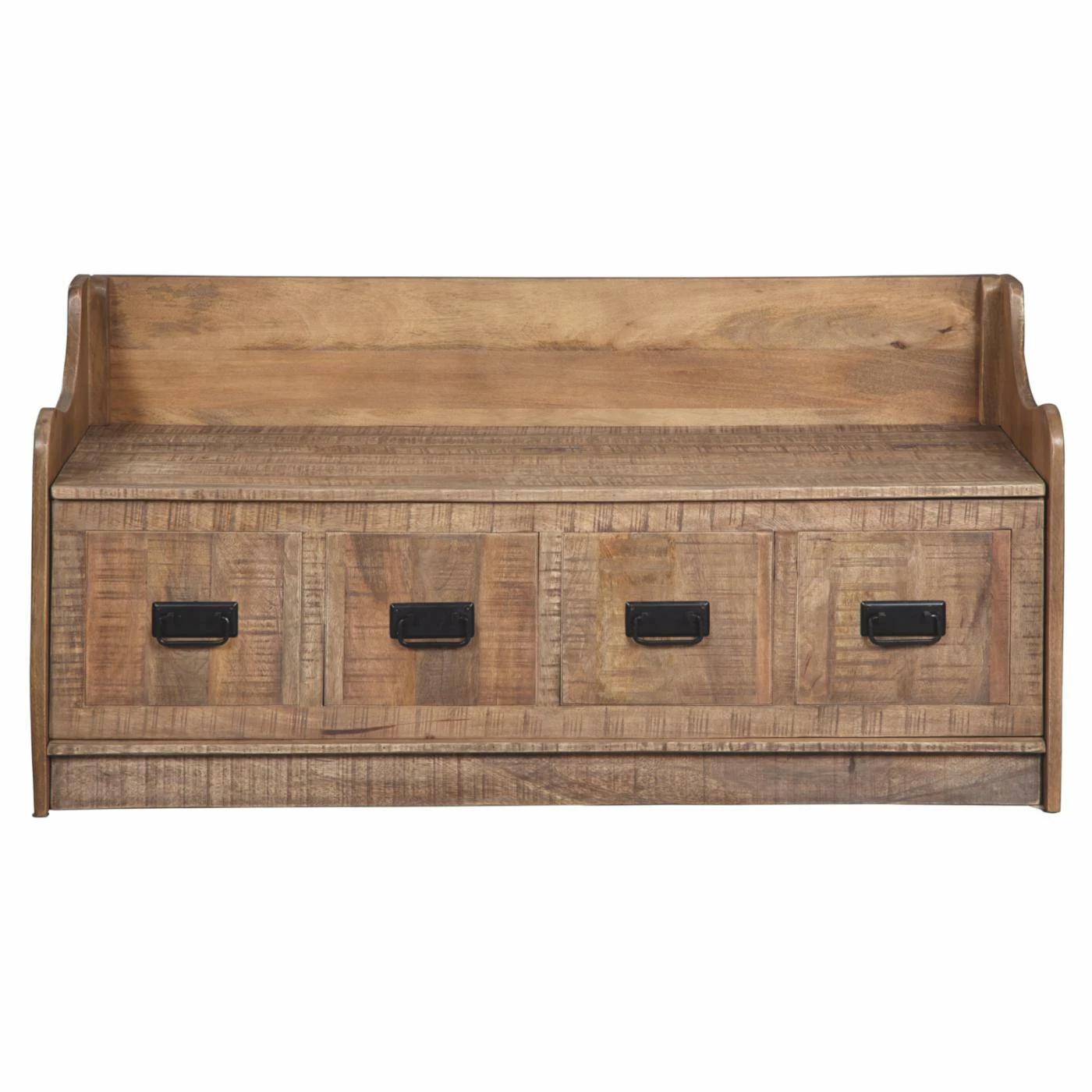 Add the Signature Design by Ashley Garrettville Storage Bench to your entryway for a handsome, rustic piece that’s replete with style and function. Its solid wood design is topped in a light brown finish that showcases a wood grain detailing. The warmth of the wood is attractively countered by the black bail pulls the outfit the faux drawer fronts. Lift the hinged seat to reveal a spacious interior that can be home to blankets, pillows, and more. Wherever you choose to style this bench, it’s sure to steal the show.