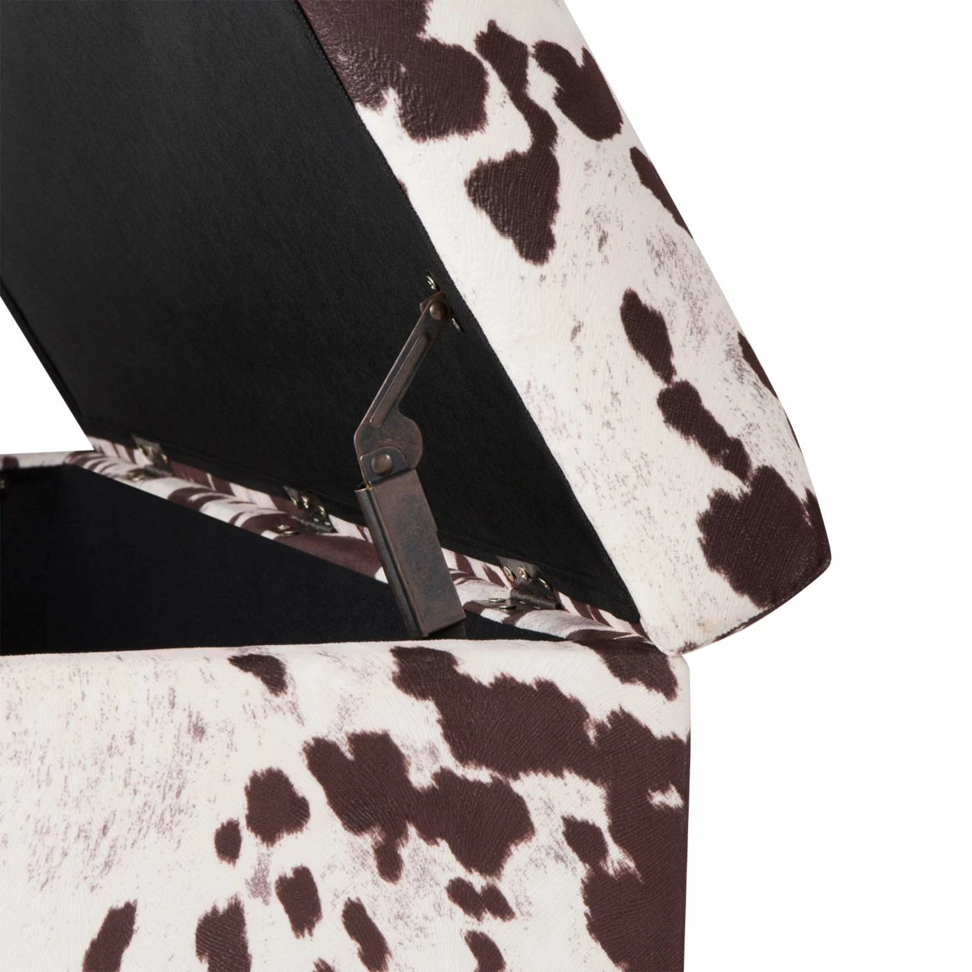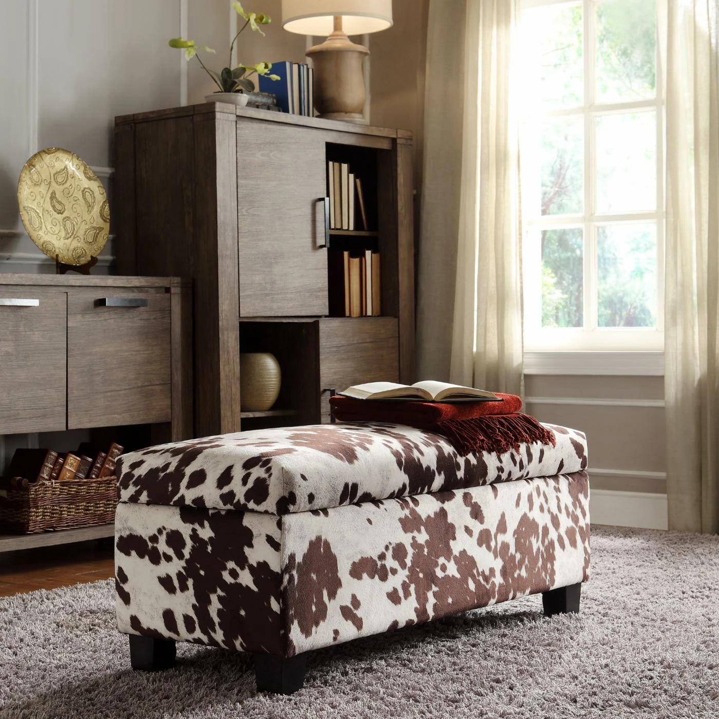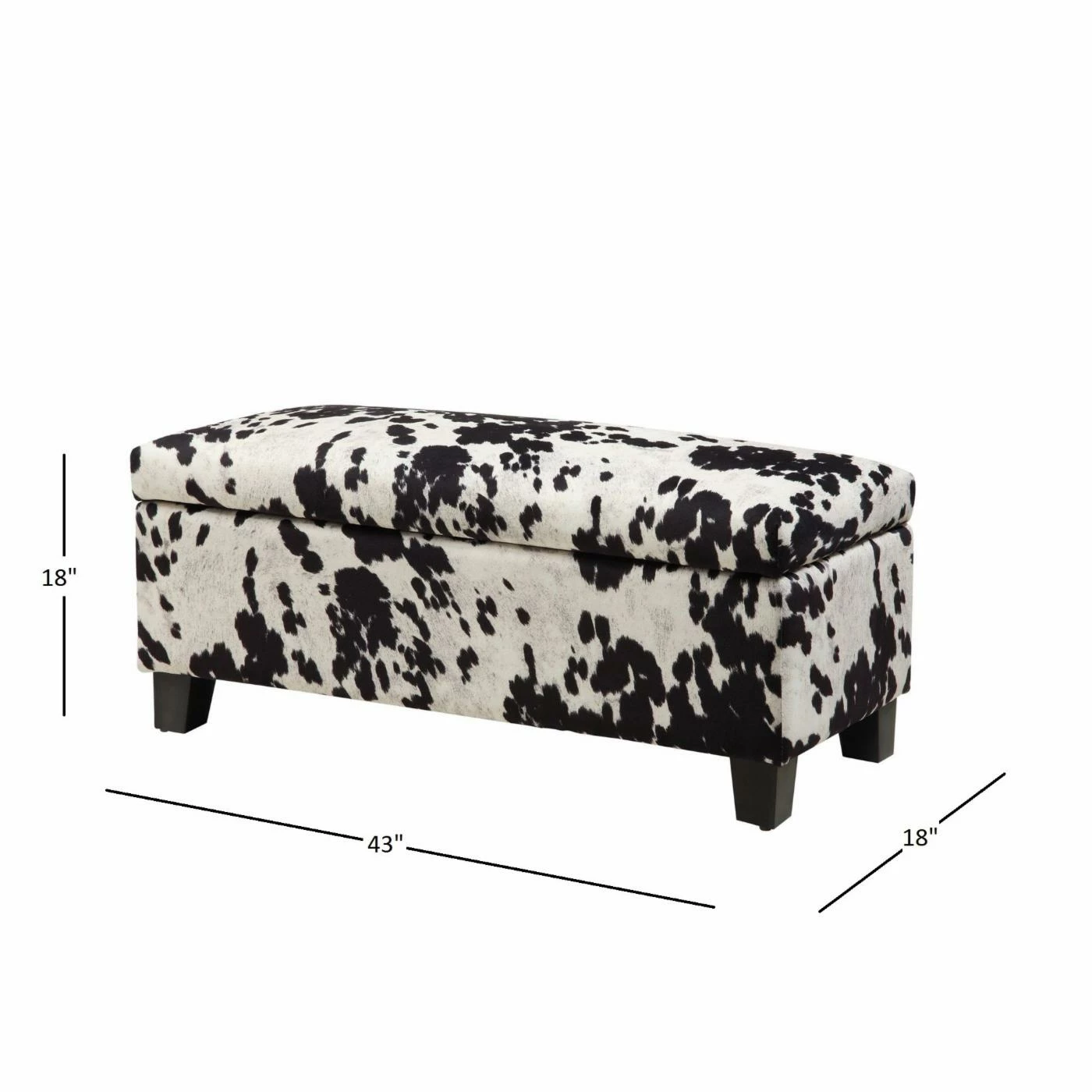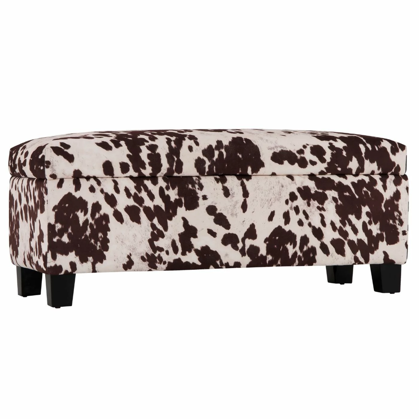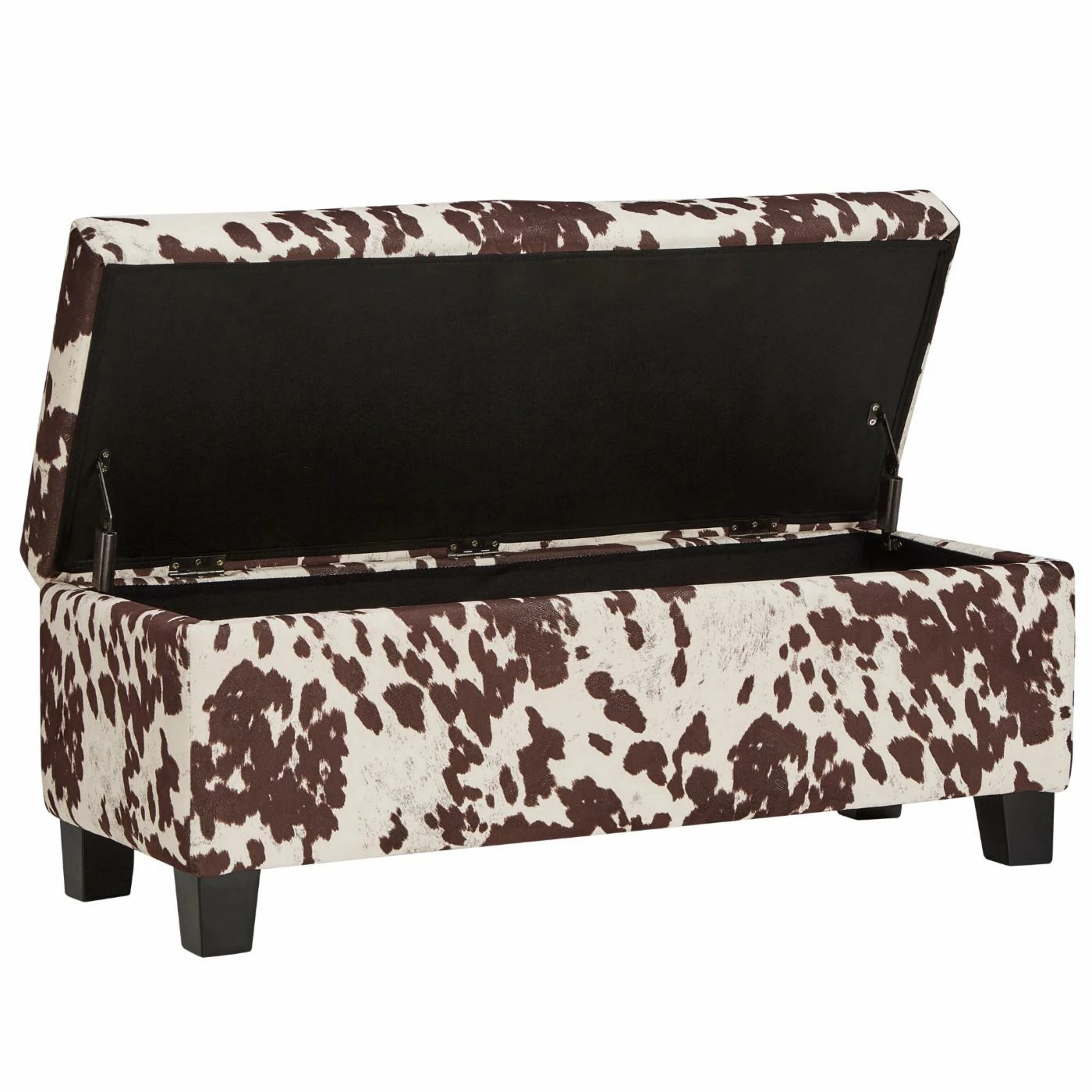 Make a distinctive impression with the luxuriously plush and handsome Weston Home Roman Cow Hide Fabric Storage Bench. Sturdily crafted of solid hardwood upholstered in cow hide fabric, this rustic bench features a foam-padded lid and generous storage for linens, towels, and more.