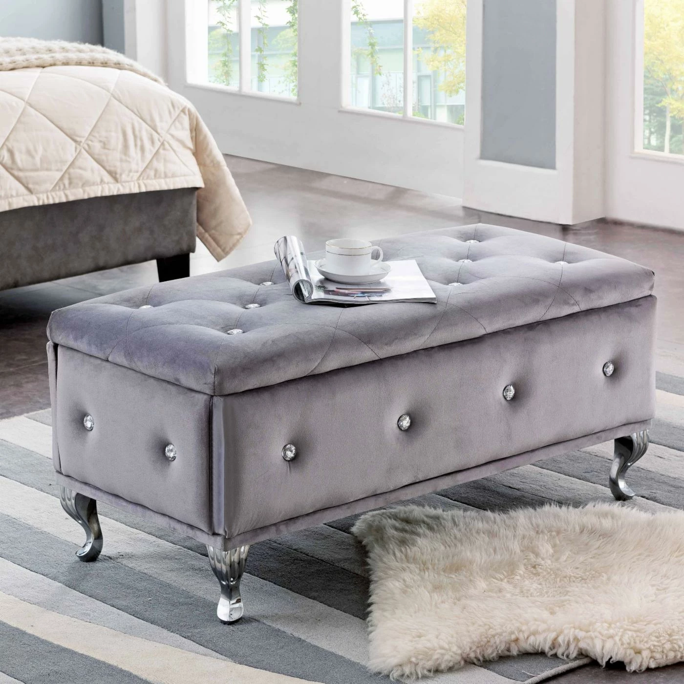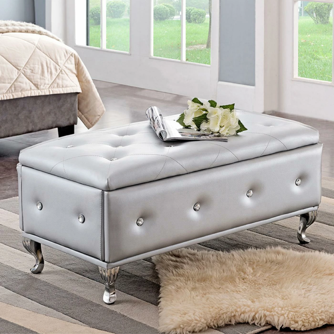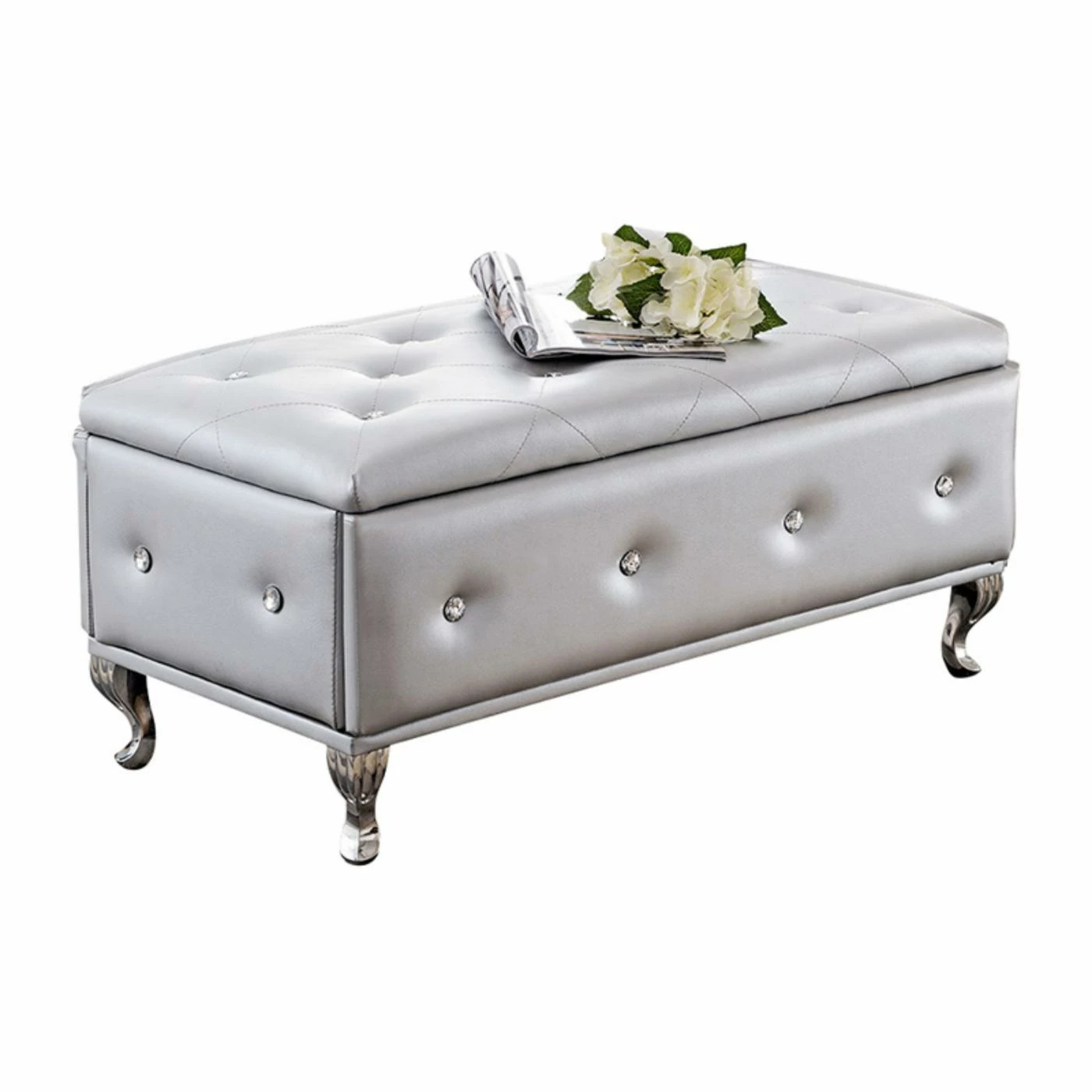 Add the K&B Furniture Upholstered Tufted Bedroom Bench to the foot of your bed for a luxurious accent piece. This elegant bench boasts a sturdy metal frame. Foam padding adds comfort. The luxurious upholstery is accented by tufted detail filled with crystal accents.
