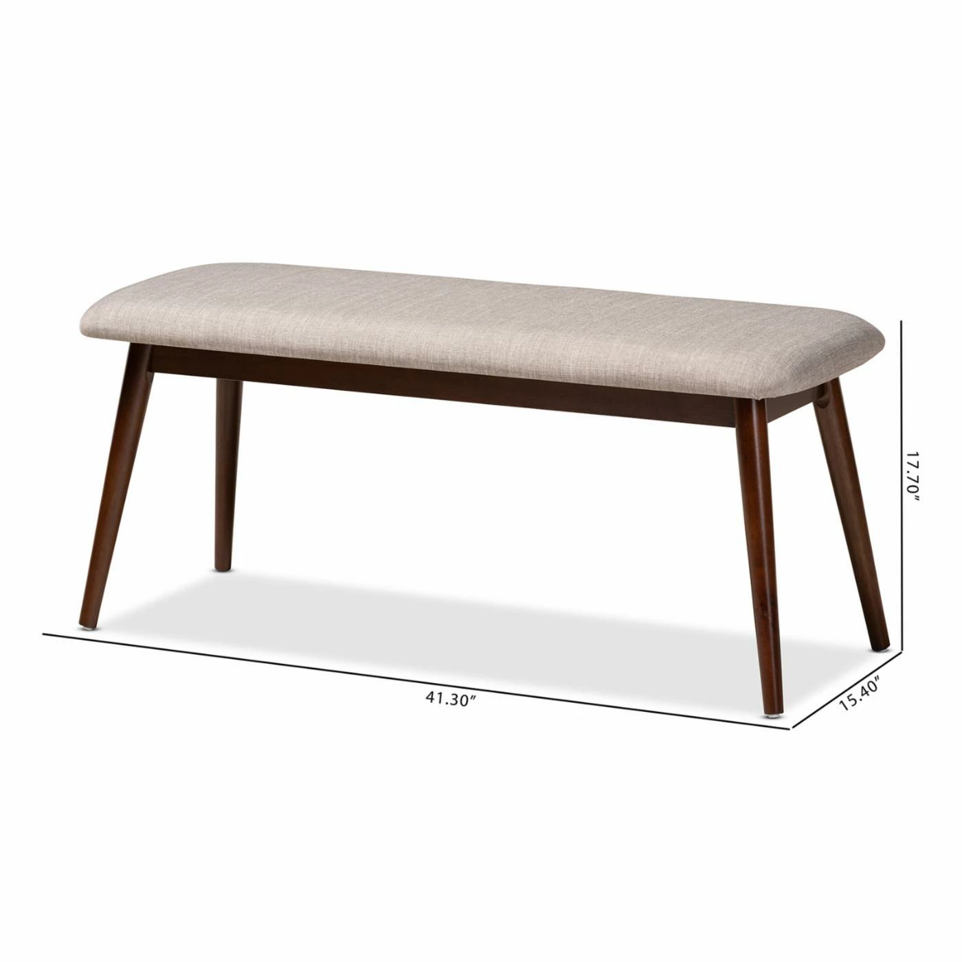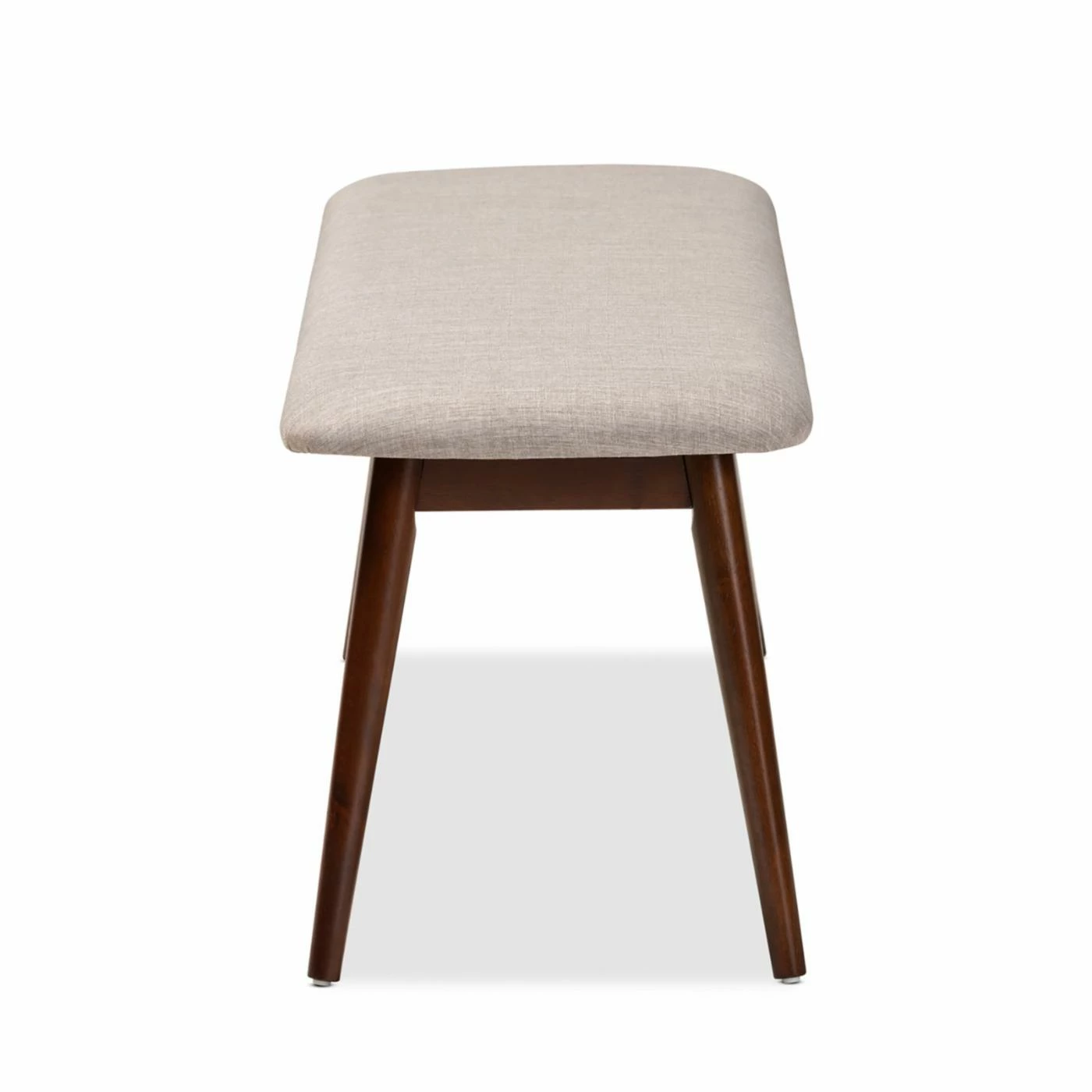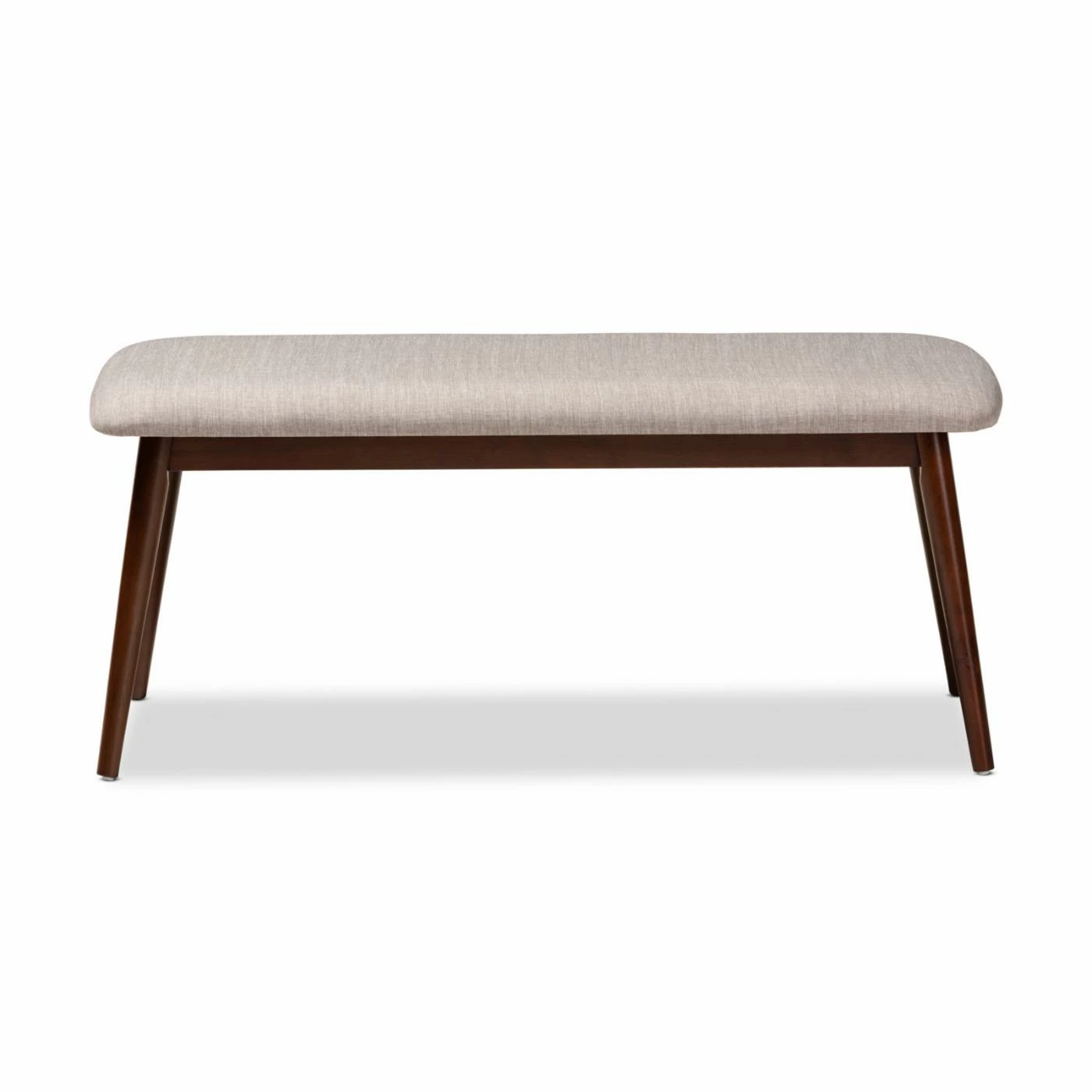 You and your guests will be sitting pretty on the Baxton Studio Flora Dining Bench. This compact bench is an easy way to put a sleek new spin on dining room décor. Slanted splayed legs in a deep, natural rubberwood stylishly support the seat of this bench, upholstered in a comfortable, neutral polyester. Style this bench with other mid-century modern or Scandinavian style pieces for a cohesive look – or mix it up and use it as a neutral accent to bright gem tones. Some assembly required. Spot clean as needed.