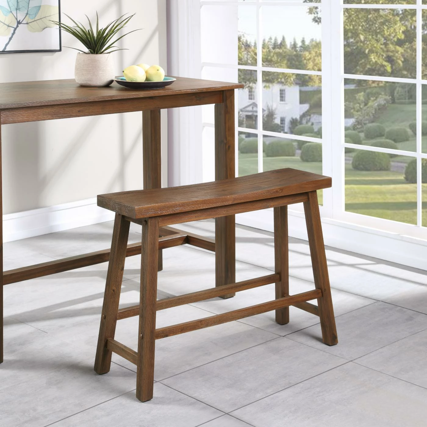 With its appealing minimalism, sturdy construction, and comfortable design, the Boraam Sonoma Dining Bench is a wonderful companion to your dining table. Its rugged acacia wood construction is topped with a multi-step finish for a stylish effect. The compact design of this dining bench allows it to be pushed under the table when not in use. A comfortable saddle-style seat accommodates two people.