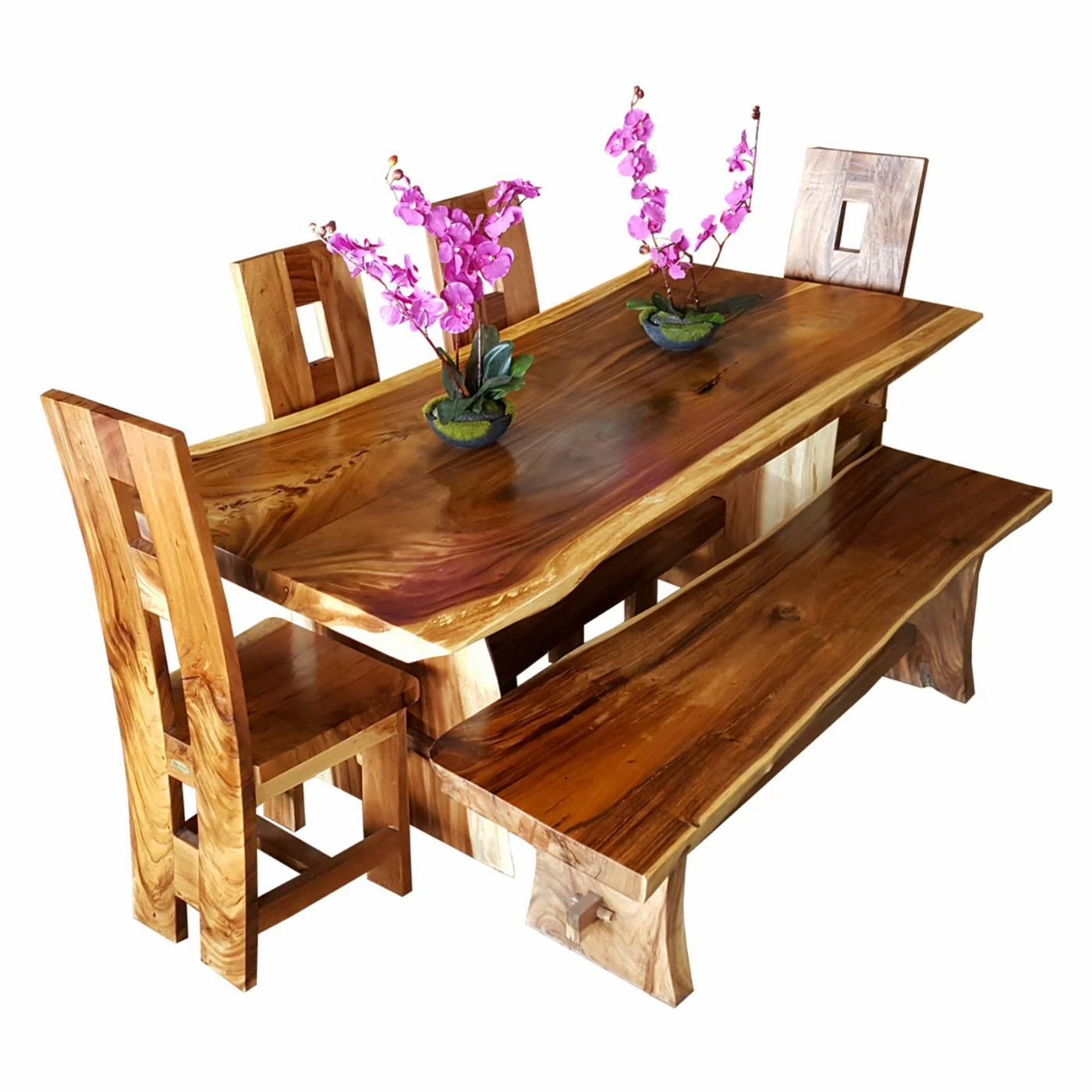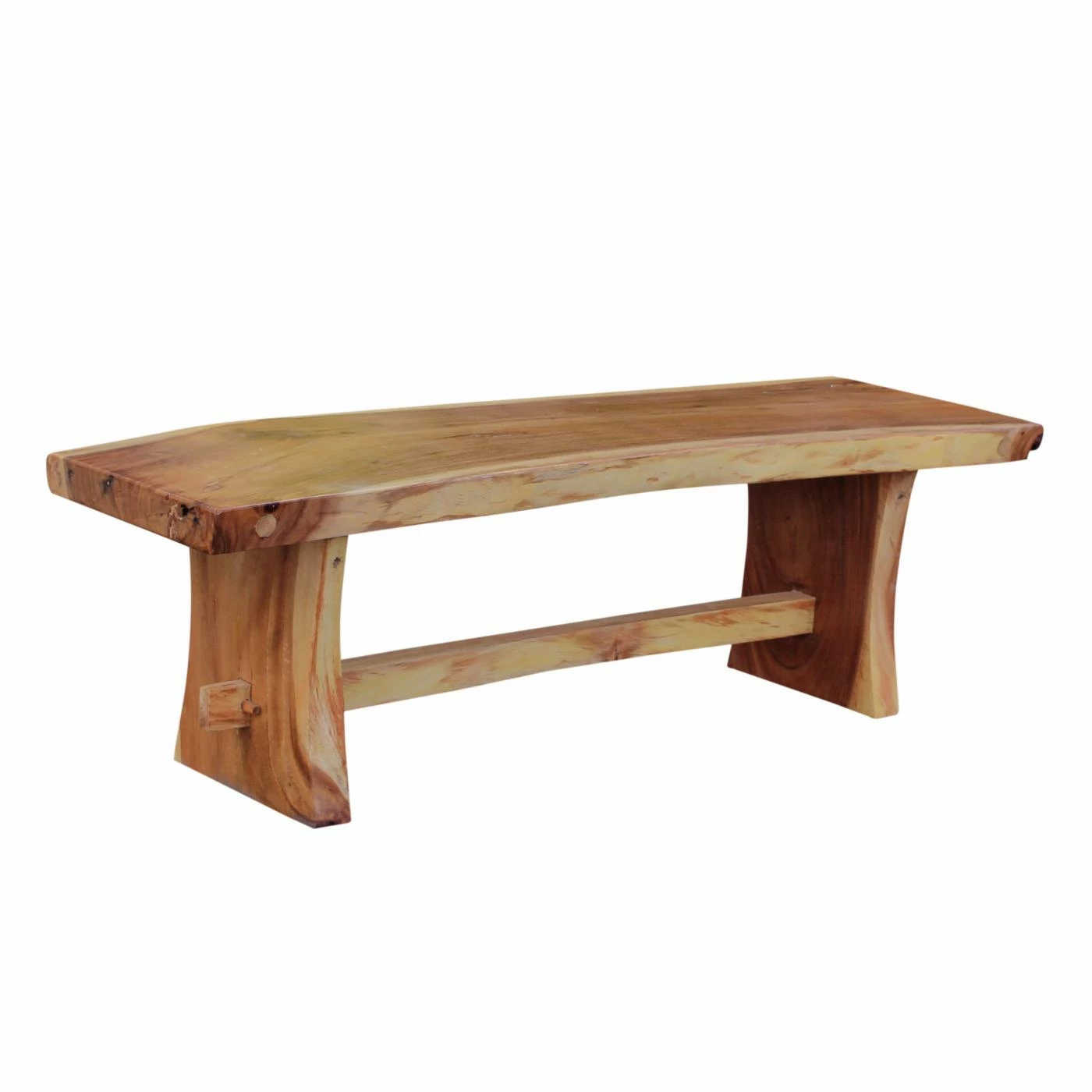 Add natural, rustic style to your home with the Chic Teak Suar Live Edge Slab Dining Bench. Constructed of solid Suar wood, this handmade bench is in a natural, warm brown finish. The live edge gives the piece a natural look and makes each bench unique. You can style this backless bench indoors or outdoors. Style it with colorful cushions, or toss a bolt of vibrant fabric across the seat.