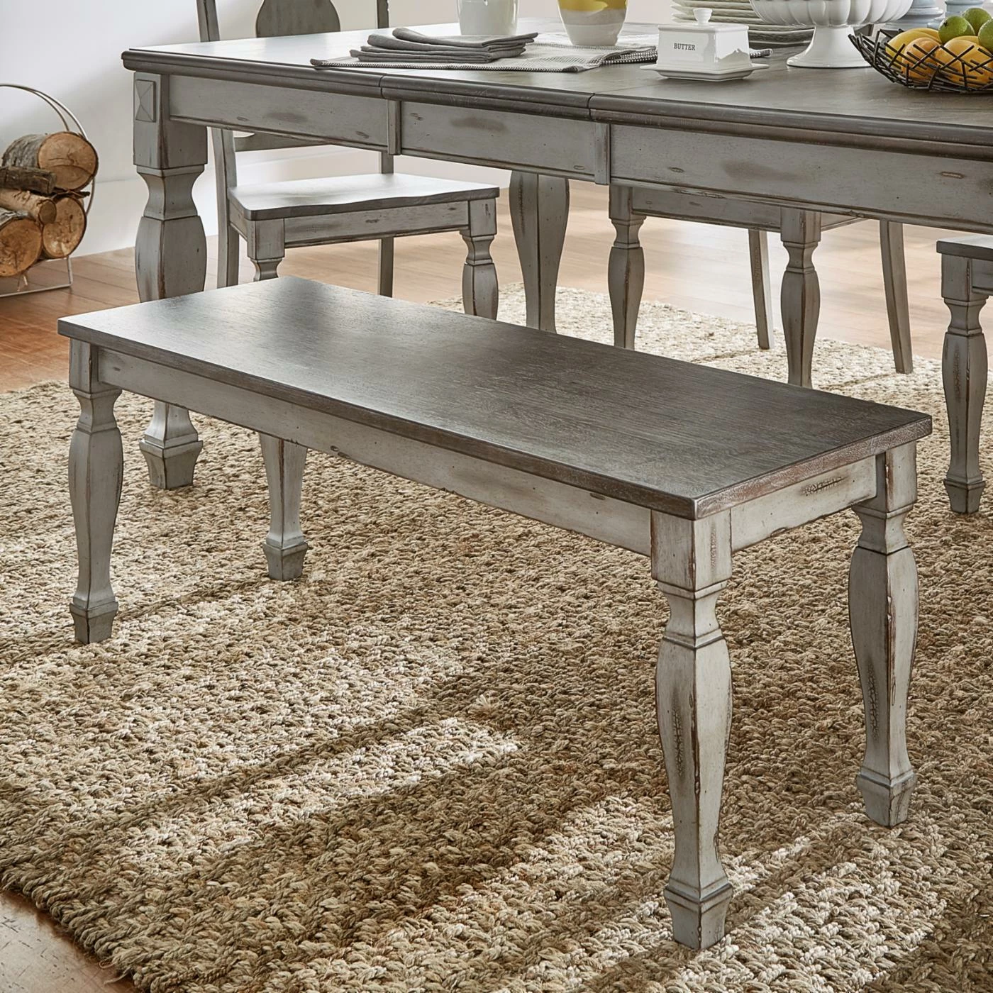 Intricately carved legs make an elegant impression in the otherwise rustic design of the HumbleNest Famers Market Distressed Two Tone Bench. This dining bench is built to last out of solid wood to provide years of use in your farmhouse kitchen or dining room. A coffee and antique gray finish enhances the visual appeal of the piece and ties the bench together with the other furnishings from HumbleNest.