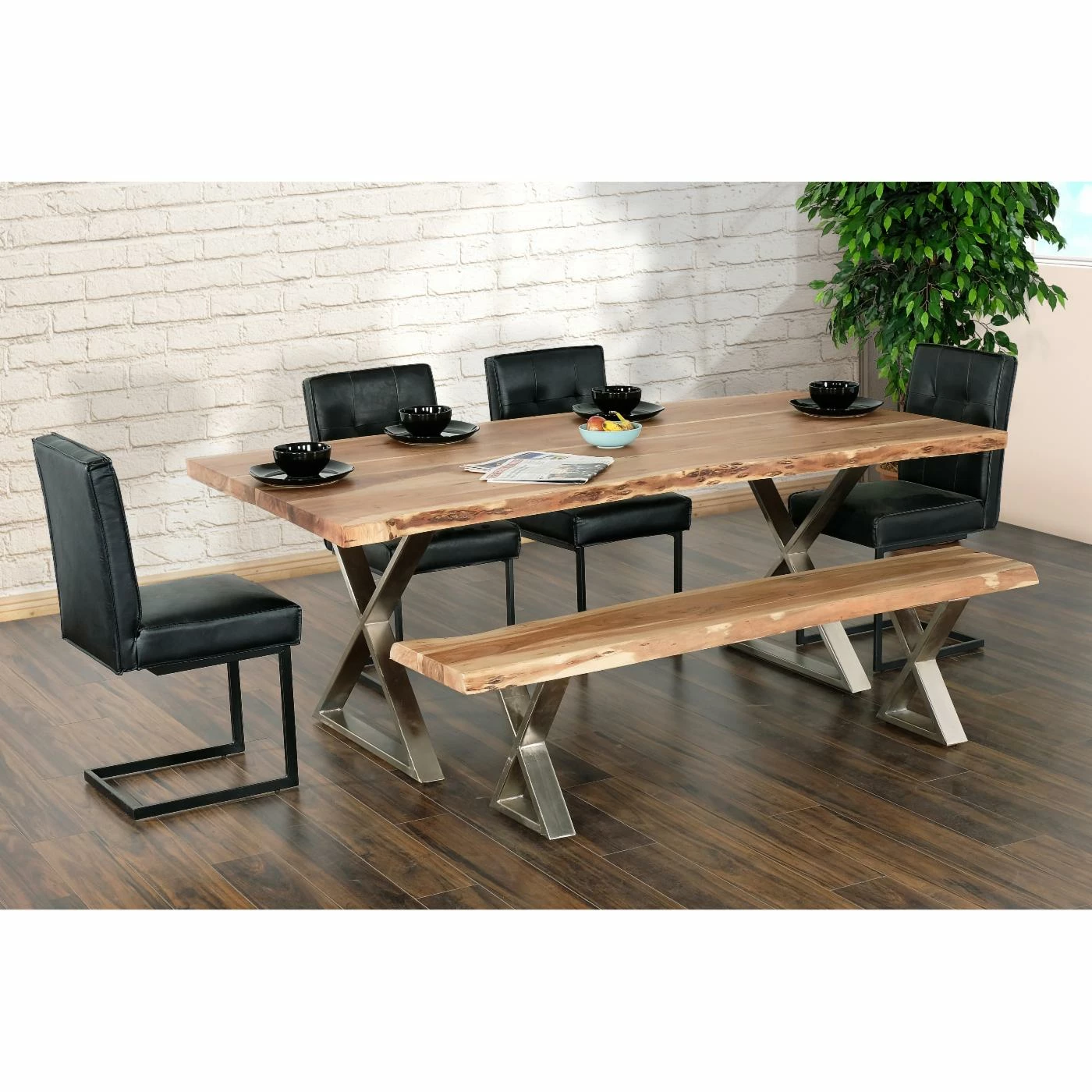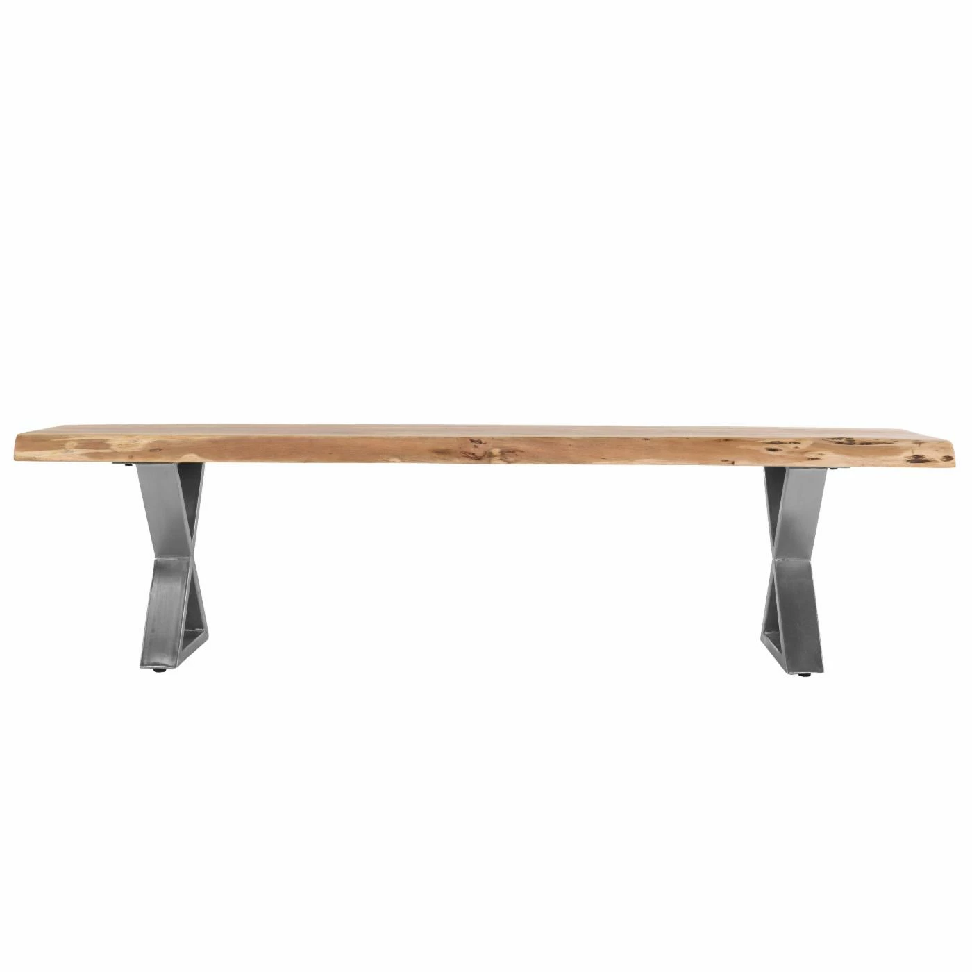 Add a touch of modern farmhouse style to your dining room with the Primo International Loomie Dining Bench. This backless bench combines industrial and rustic accents to create a truly unique piece. The X-shaped base is made of iron in a shiny silver finish, which contrasts nicely with the bench seat. Made of eco-friendly acacia wood in a natural finish, the bench seat has a live edge, which highlights the naturally occurring patterns in the wood. Pair this item with the Primo International Loomie Dining Table (sold separately on Hayneedle.com) to create a cohesive look. Some assembly required.