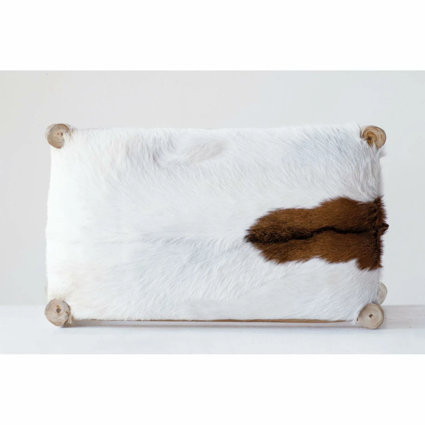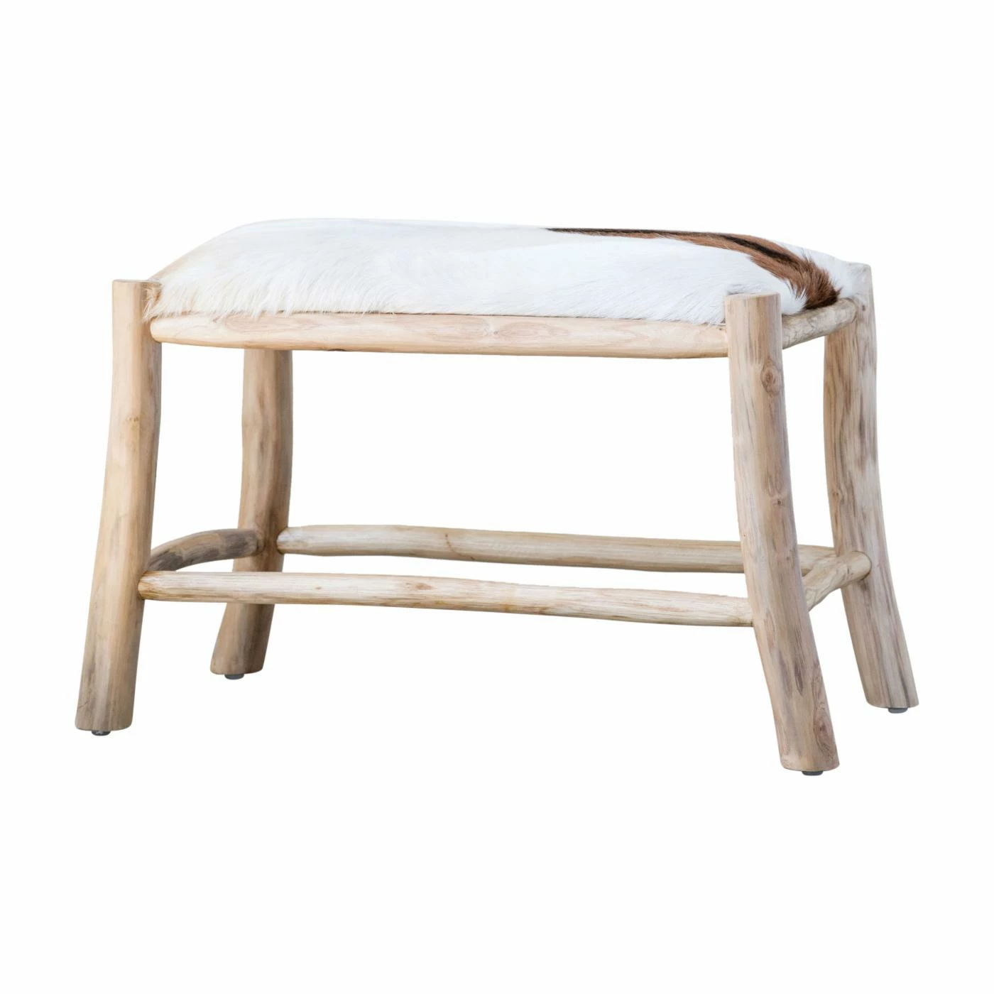 Give your interior dΓ©cor a warm artisan touch with the 3R Studios Rustic Goat Hide and Wood Indoor Bench. This bench makes a dashing decorative side accent or singular seat for a mid-century writing desk. Its frame is made from durable wood boughs with a natural light brown tone, complete with wood grain and knots. Dense foam pads the seat, upholstered in genuine goat-hide leather with white and brown patches. Thanks to the real leather, no two pieces look exactly the same.
