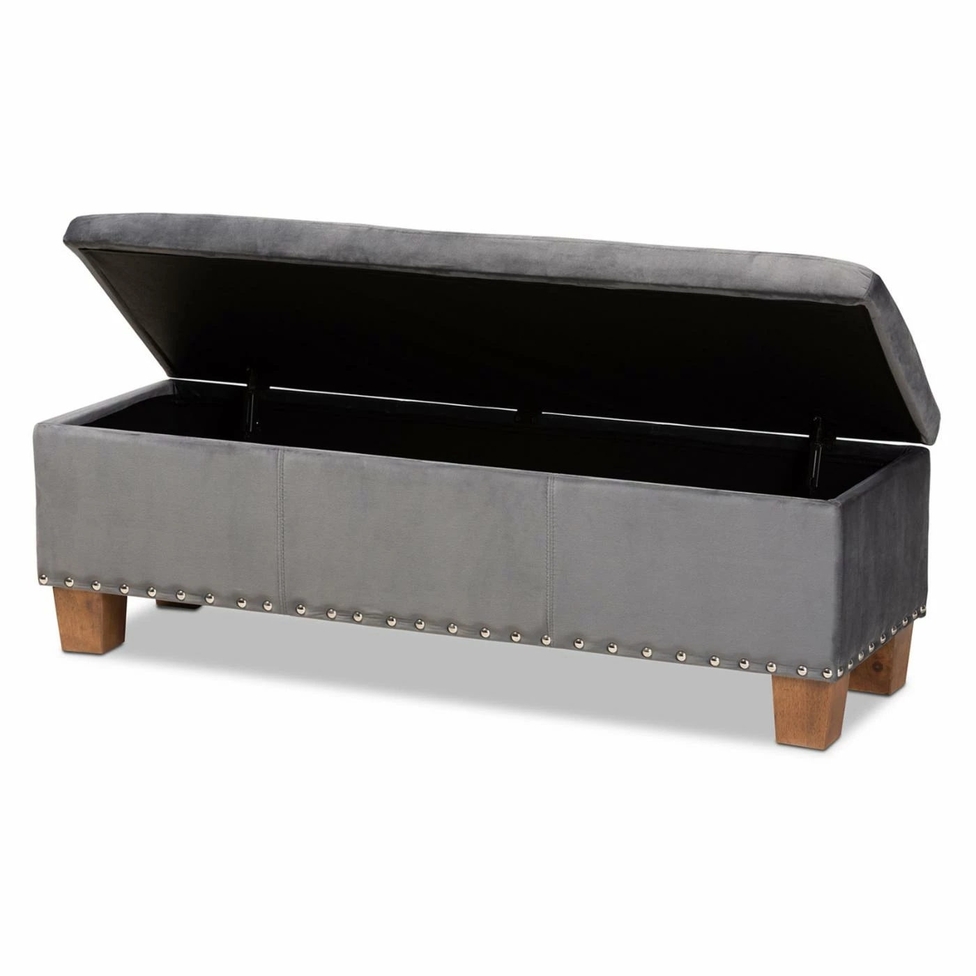 Stylish and functional, the Baxton Studio Hannah Velvet Tufted Storage Ottoman Bench with Nailhead Trim is sure to be a great addition to your living room, family room, or bedroom. This backless bench can also be used as an ottoman or coffee table, and the top opens to ample storage for blankets, throw pillows, and other items. Upholstered in velvet polyester, this bench features block wood legs in a walnut finish, as well as plush tufting on the lid. Silver nailhead trim adds a touch of glam to the piece. Choose from available fabric colors to find the Baxton Studio Hannah Velvet Tufted Storage Ottoman Bench with Nailhead Trim that works best for your home.
