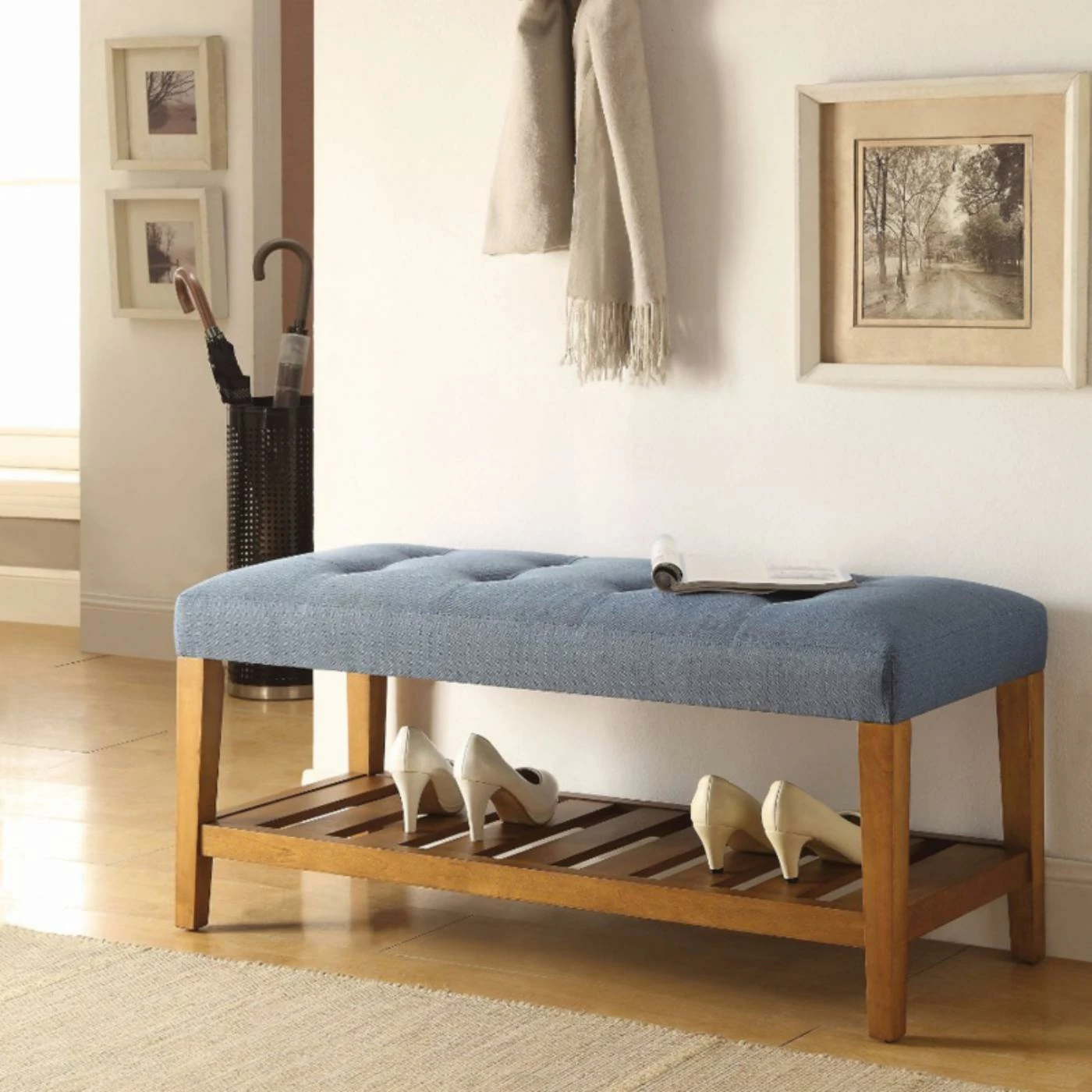 With its slatted lower shelf, the Benzara Wooden Backless Bench is perfect for storing everything from shoes in your entryway to reading materials in your living room. The solid and engineered wood frame is sturdy enough to withstand the effects of daily use wherever you display the bench. For comfort and added elegance, the foam-cushioned seat is wrapped with velvety fabric and button tufted.