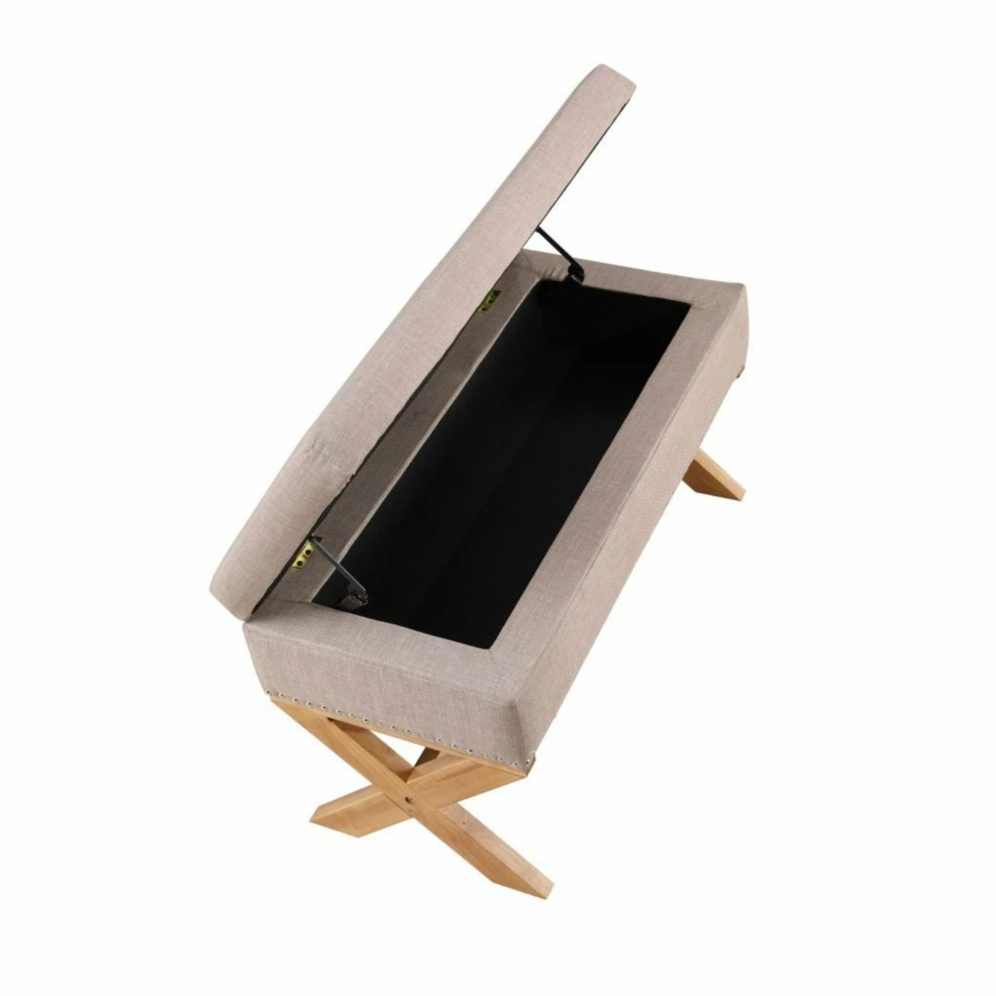 - The storage bench is covered in fabric upholstery