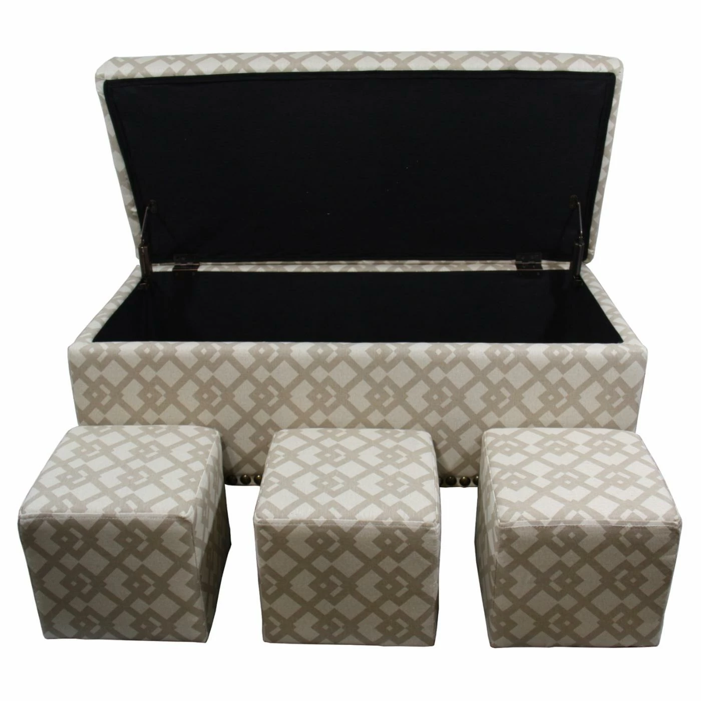 Banish folding chairs and go with a much moreelegant option for occasional seating. The Ore International Geometric Bench with 3 Seatings is a generously-sized storage bench with a flip-top lid. Inside, you’ll find three additional upholstered seating cubes that can be used as footrests, ottomans, or seating for your guests. Upholstered in a geometric link pattern, this set will find infinite uses, from the playroom to the family or living room to the master suite. Engineered wood frames are fully concealed beneath the padded upholstery. The three-seat storage bench features mammoth nailhead trim around the bottom edge, and can be used to store playthings, off-season clothing, or extra linens when the seating cubes come out to play.