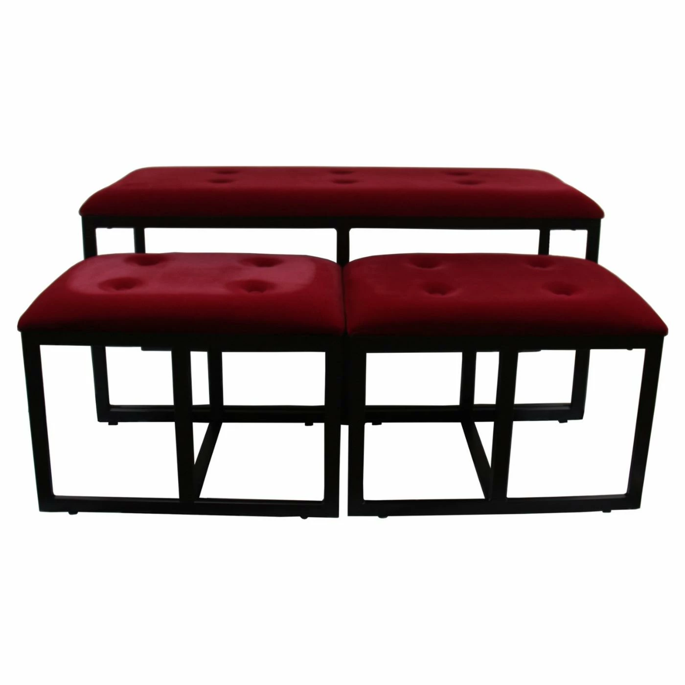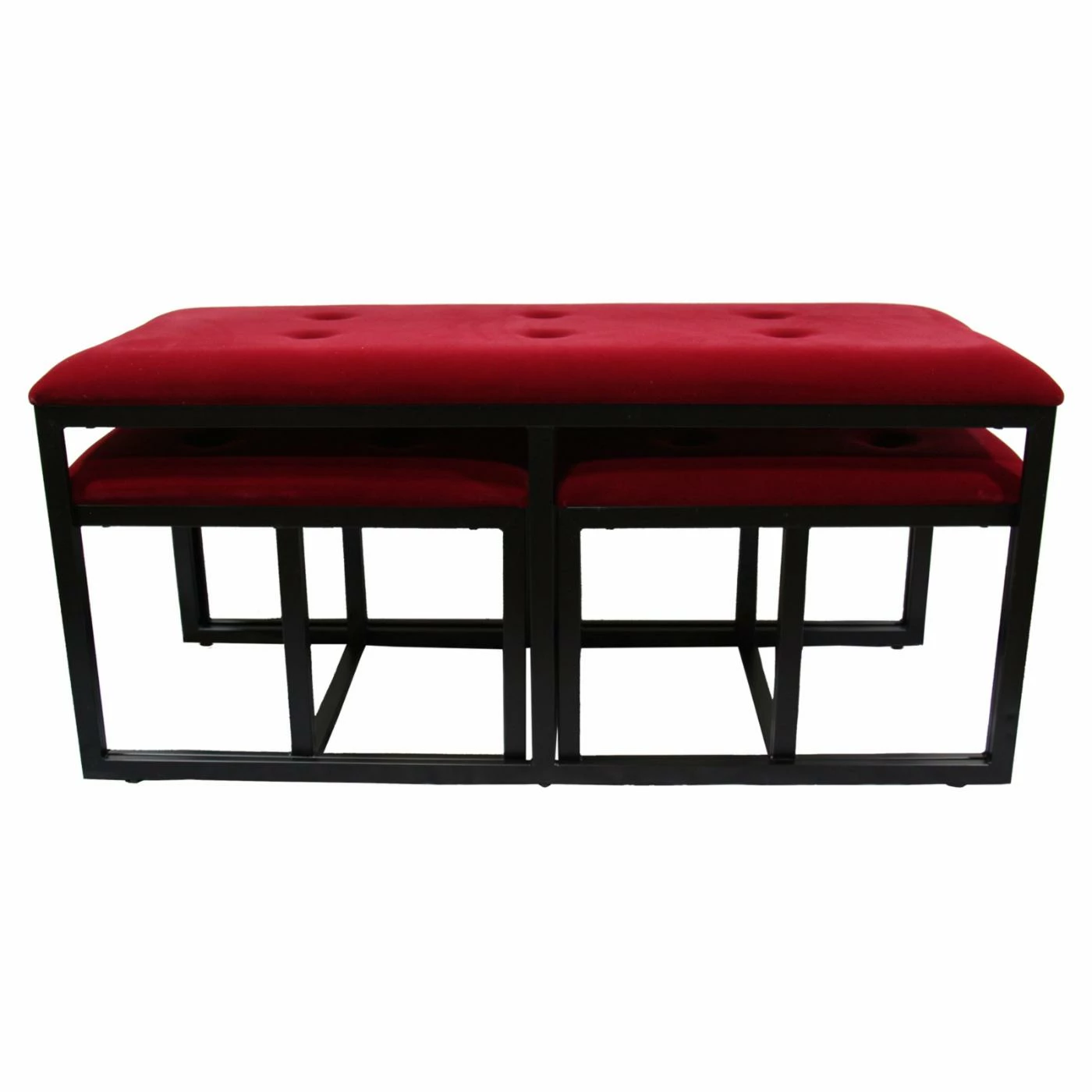 Dramatic, elegant, and totally functional, the Ore International Tufted Bench with 2 Seatings presents an upscale way to keep seating for four. This contemporary modern bench keeps a low profile while sheltering two additional upholstered, backless occasional seats which can each seat one. Stunning in your living room or at the foot of your bed, this bench set offers the ultimate in versatility. The button tufted style is timeless and certainly not going out of style anytime soon. Metal frames have a satin black finish for a dramatic contrast with the sultry red faux suede upholstery.