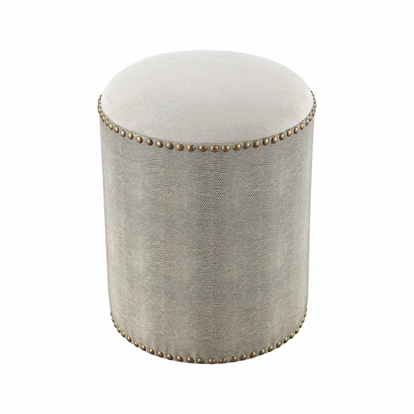 With its pill box-shaped silhouette, this Sterling Sands Point Round Bench brings an exquisite, mid-century vibe to your living room. This beautiful accent bench comes in two different sizes and features a grey, faux-shagreen finish with pleasing granular hide patterns. The elegant, golden nail trim makes this stool a great addition to your home decor.