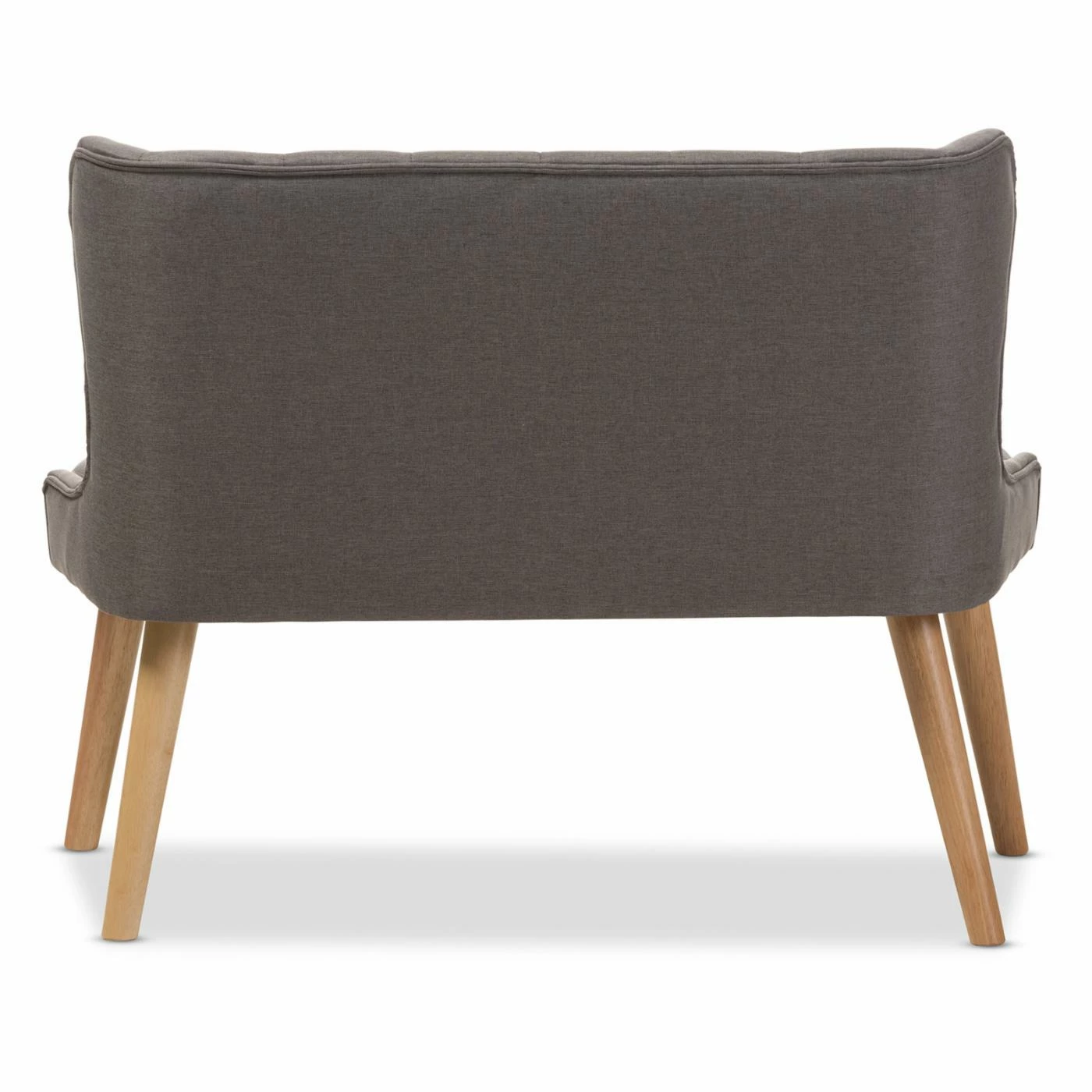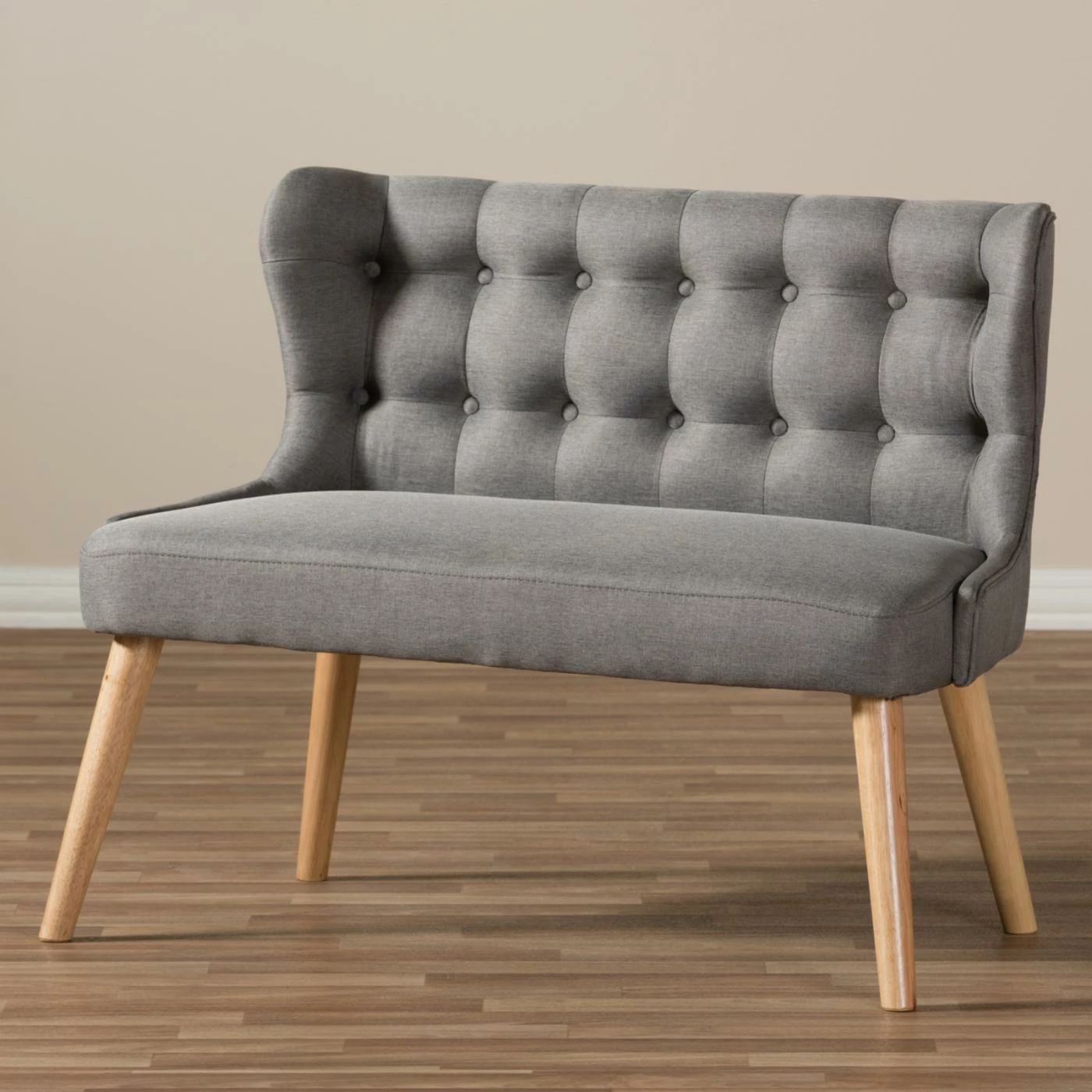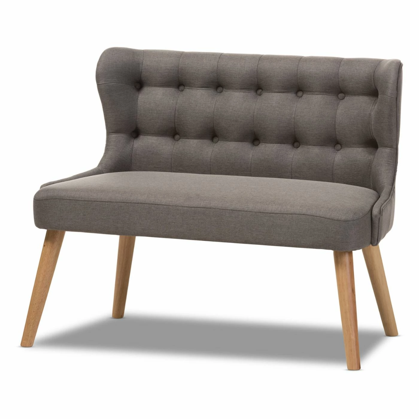 Enjoy a perfect place to put your feet up with the Baxton Studio Melody Mid-Century Modern Grey Fabric and Natural Wood 2 Seat Settee Bench. This wide settee bench offers space for up to two, featuring a wide seat and wingback sides. The frame is crafted from metal and rubberwood solids with splayed, tapered feet, finished in a handsome light oak. Thick foam pads the seat, which is upholstered in a light gray polyester fabric. The backrest has a classic square-tufted design.