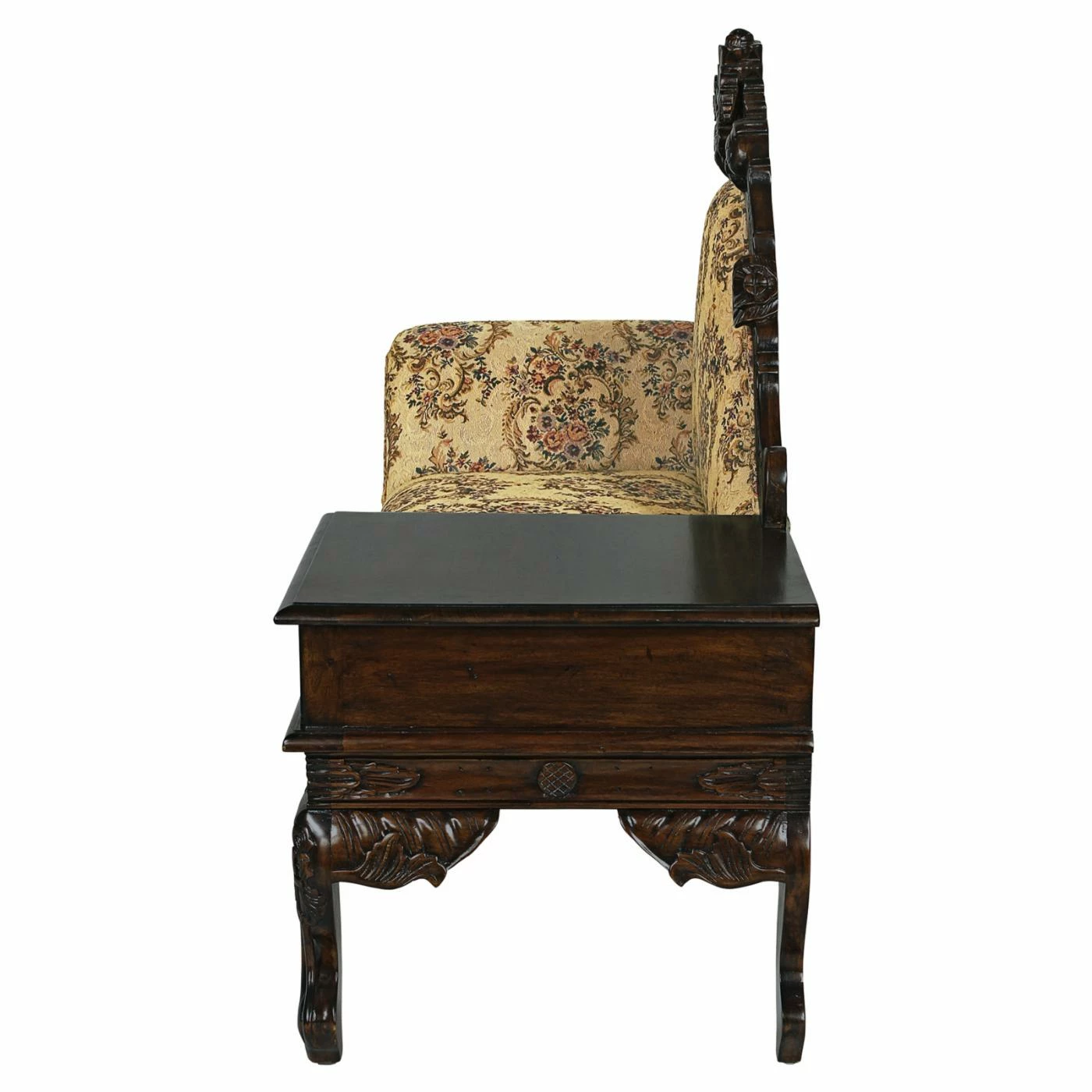 Settle in on the Design Toscano Victorian-Style Gossip Bench and sip tea in proper Victorian style. This romantic solid mahogany settee shows off the opulent aesthetics of the time with its hand-carved rose crown, floral apron, and cabriole legs. Regal floral fabric covers the padded rolled arm, backrest, and seat and brings soft colors to interiors. An integrated side table keeps your tea set readily accessible and has a single drawer where you can keep your journal or favorite Jane Austen novel.