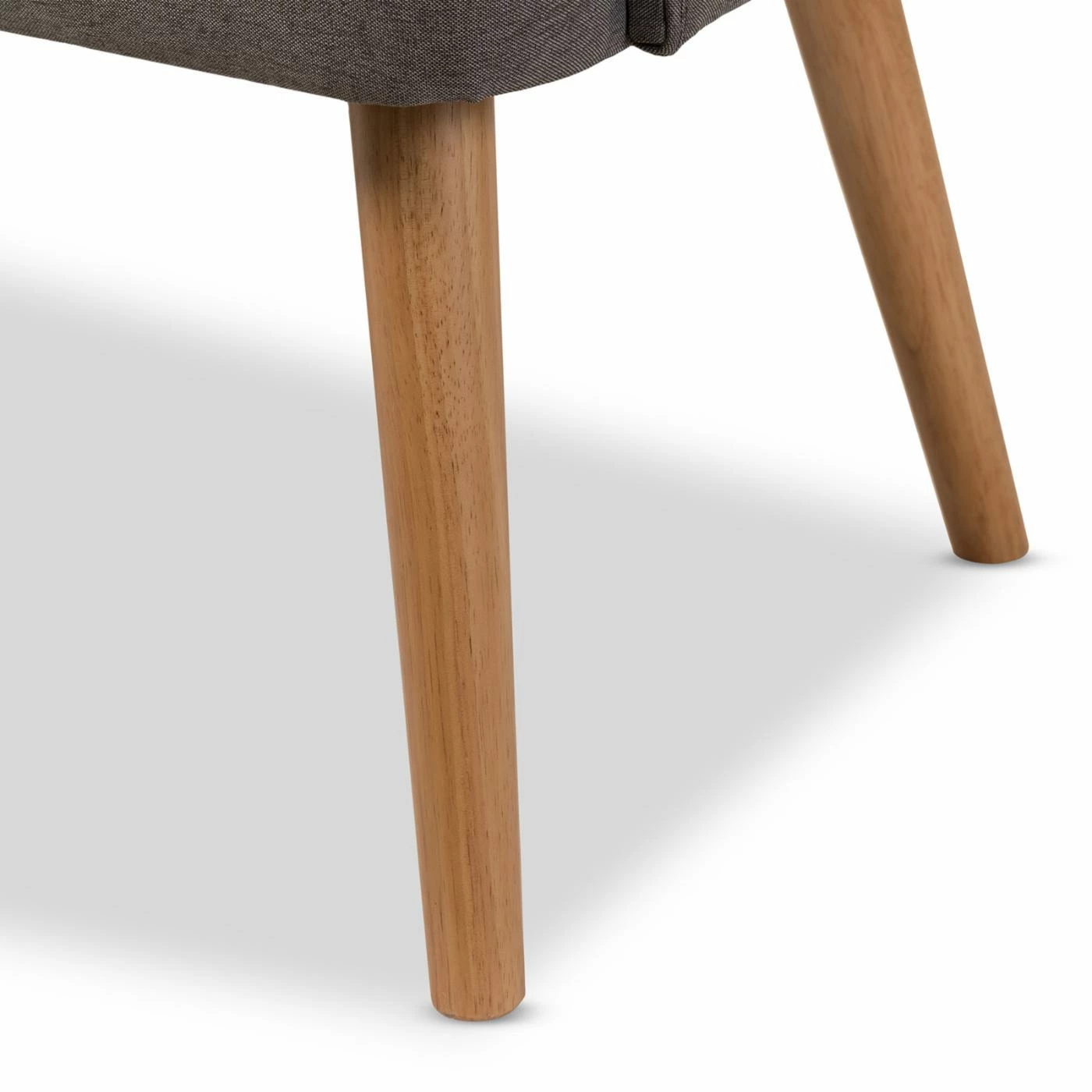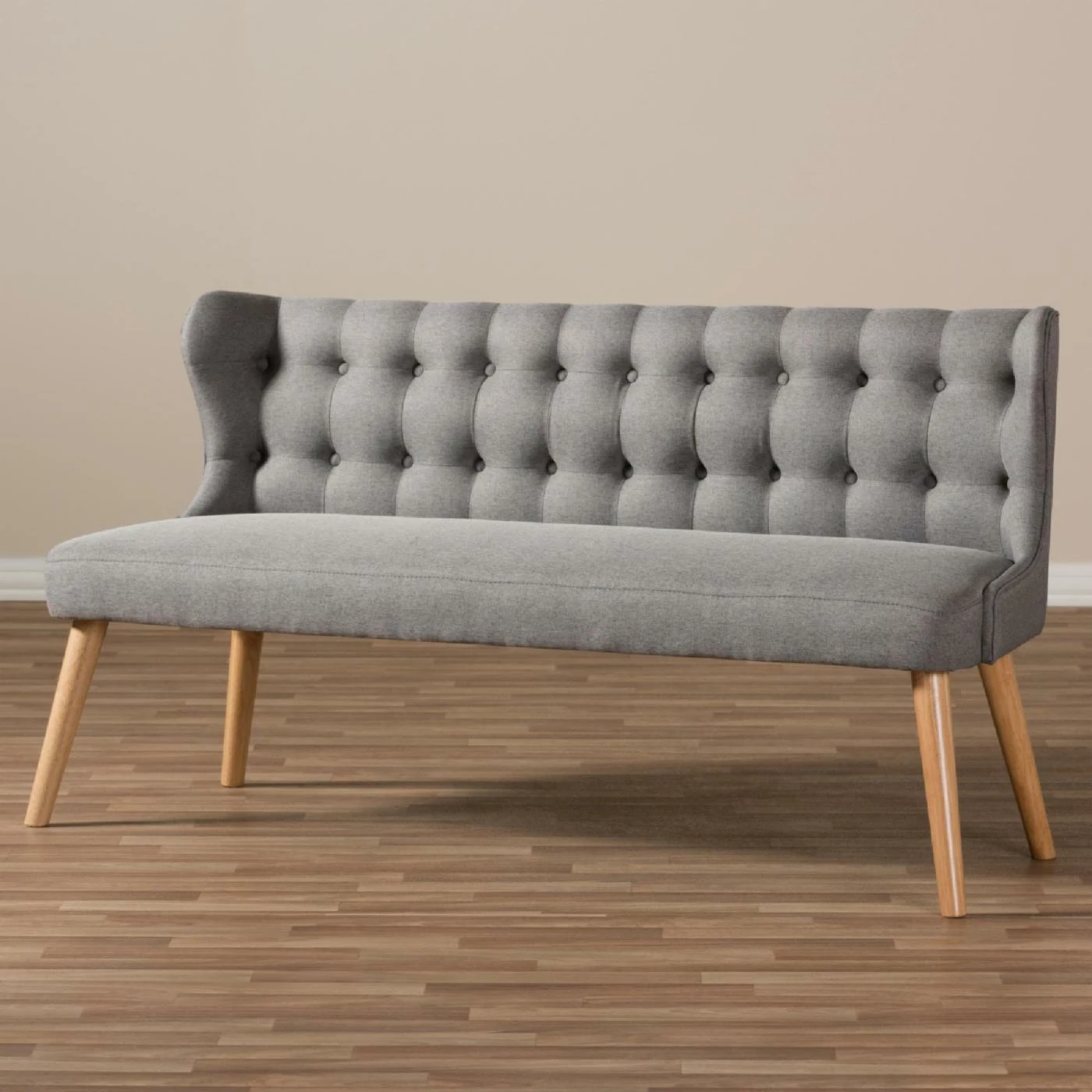 The HN Home Arets Mid-Century Modern Grey Fabric and Natural Wood 3 Seat Settee Bench is an exciting alternative to a traditional sofa or loveseat. This wide settee bench comes with a dynamic mid-century look, with splayed legs and a wingback seat. The legs are crafted from solid rubberwood and finished in a light oak color. Plump foam is used to pad the seat, which is topped by a long-lasting and soft polyester upholstery. The fabric has a light gray color and a deep square-tufted pattern.