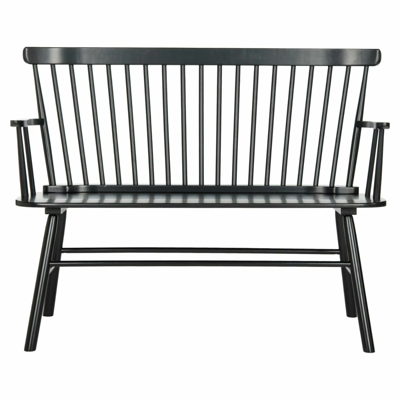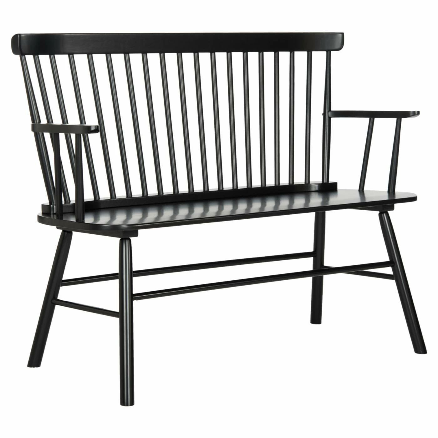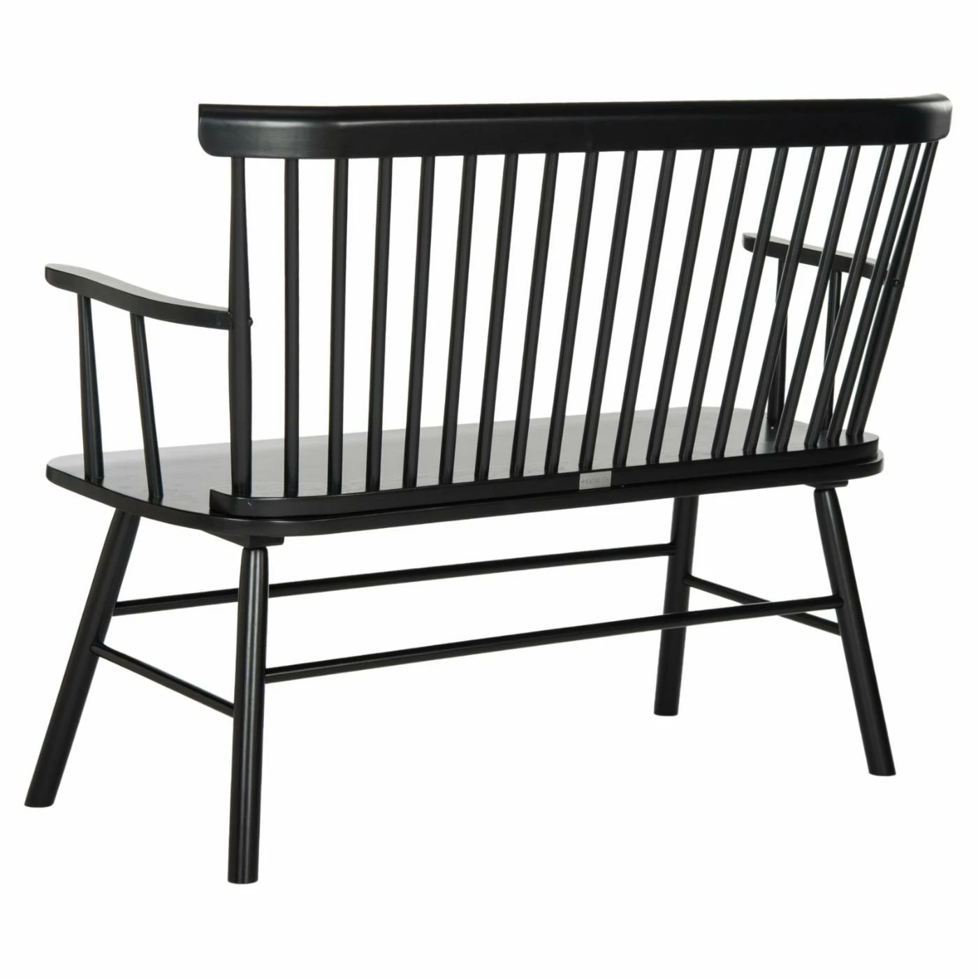 Provide an extra seat and enhance the Old World appeal of your home with the Safavieh Addison Settee. The bench showcases a timeless design with a gently curved backrest, angled spindles, shaped arms, and diagonal legs. The solid rubberwood construction makes the bench sturdy enough to accommodate two people, and the neutral black finish ensures a perfect match with your interior.