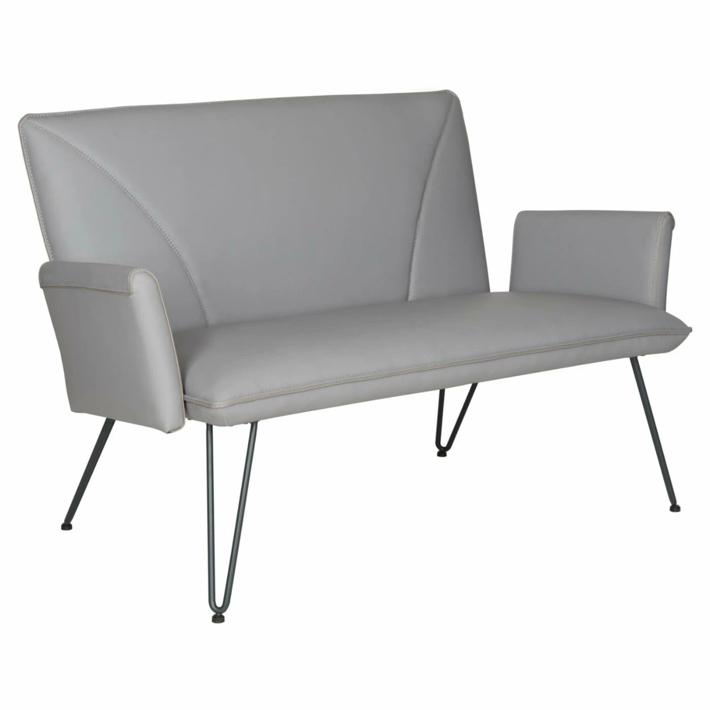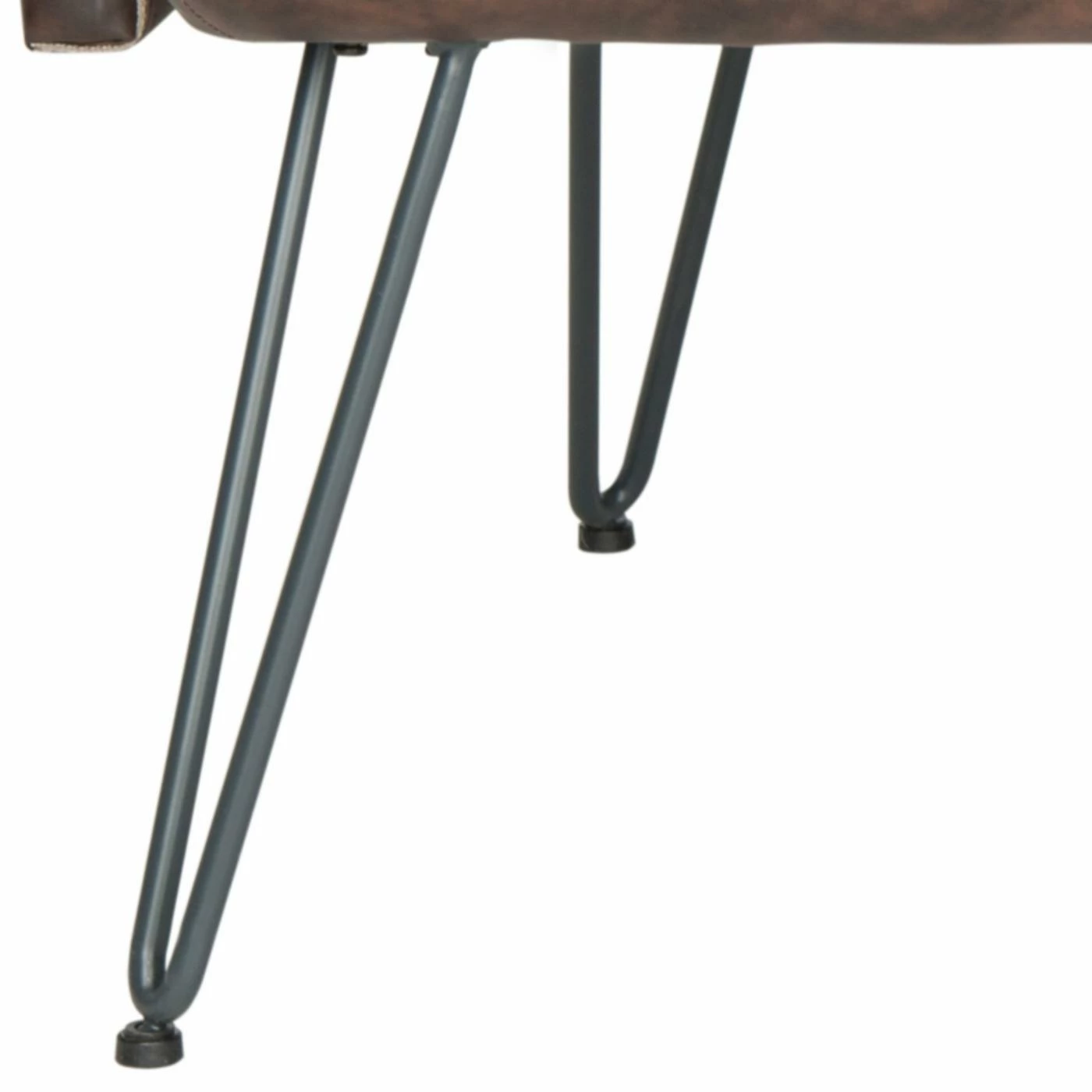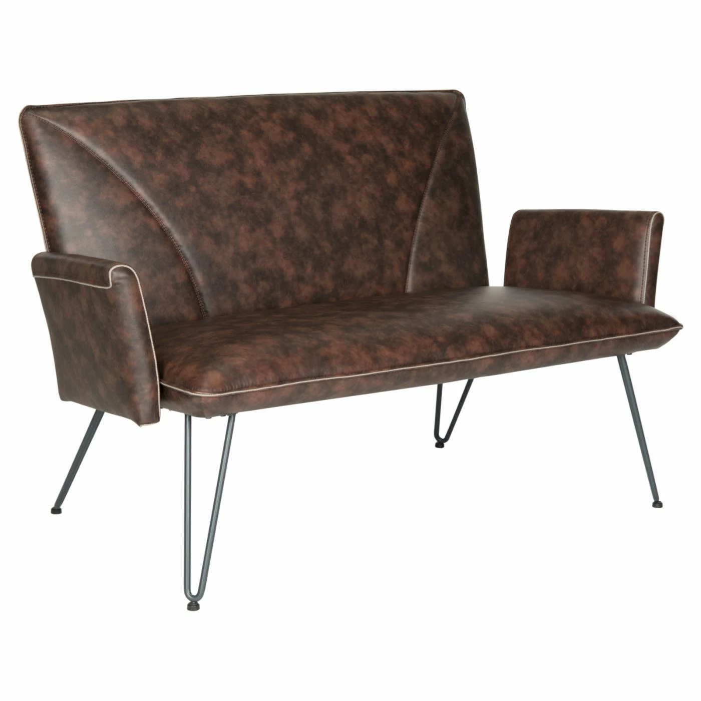 Sit back and relax in retro style on the Safavieh Johannes Leather Settee. Hairpin iron legs, a boxy back, bench seat, and flared arms give the settee the design of a vintage original. For comfortable support, the seat features bandage straps and wood batten suspension padded with foam. Bi-cast polyurethane upholstery provides the sumptuous feel of leather, while ensuring easy care. Plastic caps cover each leg to protect your floors.