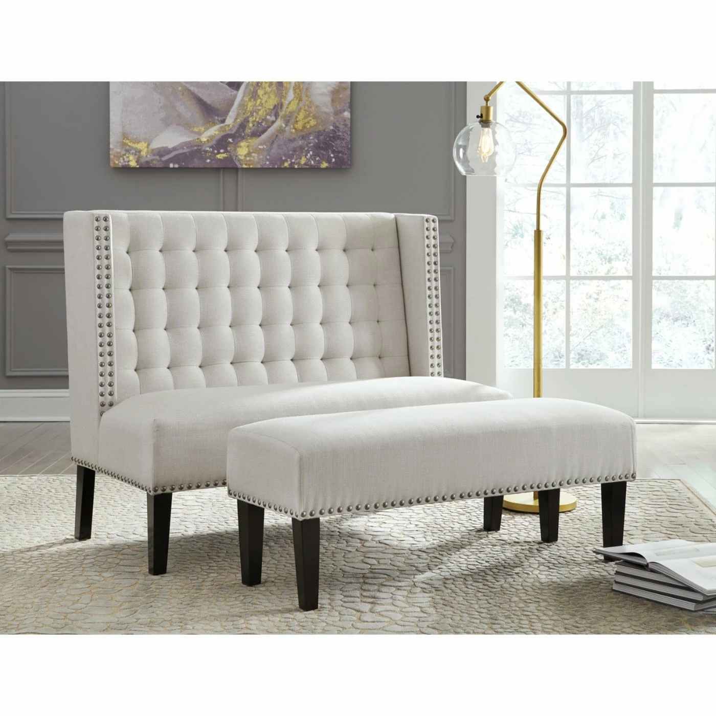 If your living room or entry could use a little drama: Darling, the Signature Design by Ashley Beauland Accent Bench is here to bring it. From its graceful tufting to its posh nailhead trim, this accent bench is used to getting all the attention. Its robust rubberwood frame is topped with a foam cushioned seat that’s upholstered in polyester in a crisp oatmeal hue. Wherever you style it, this piece is sure to glean praise.