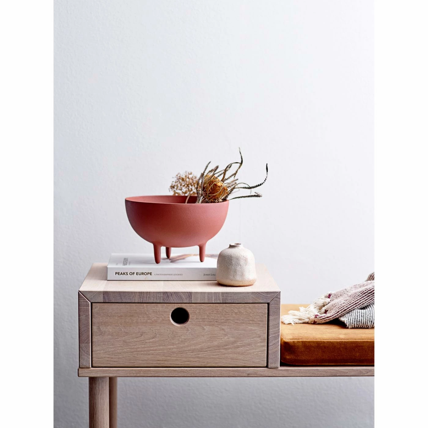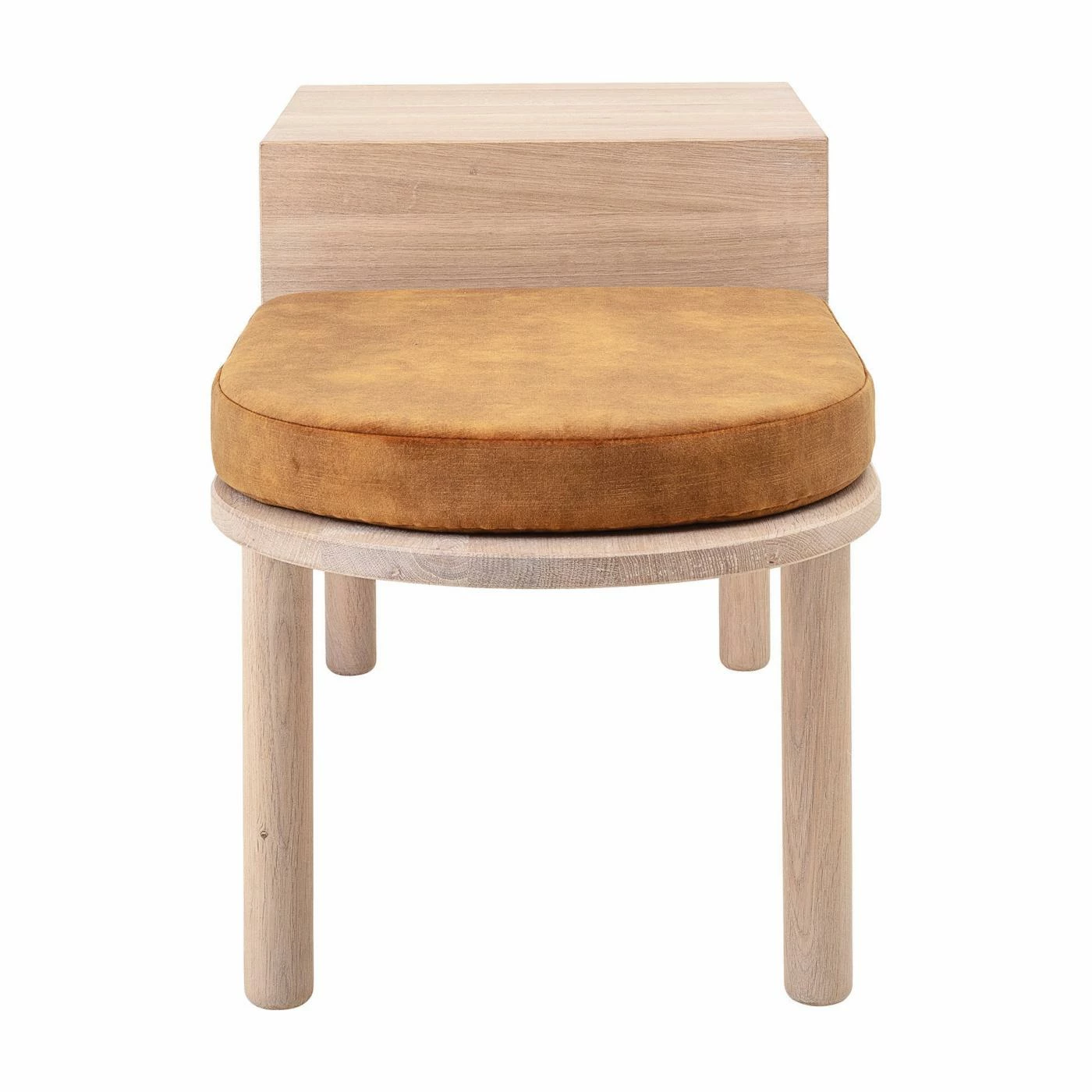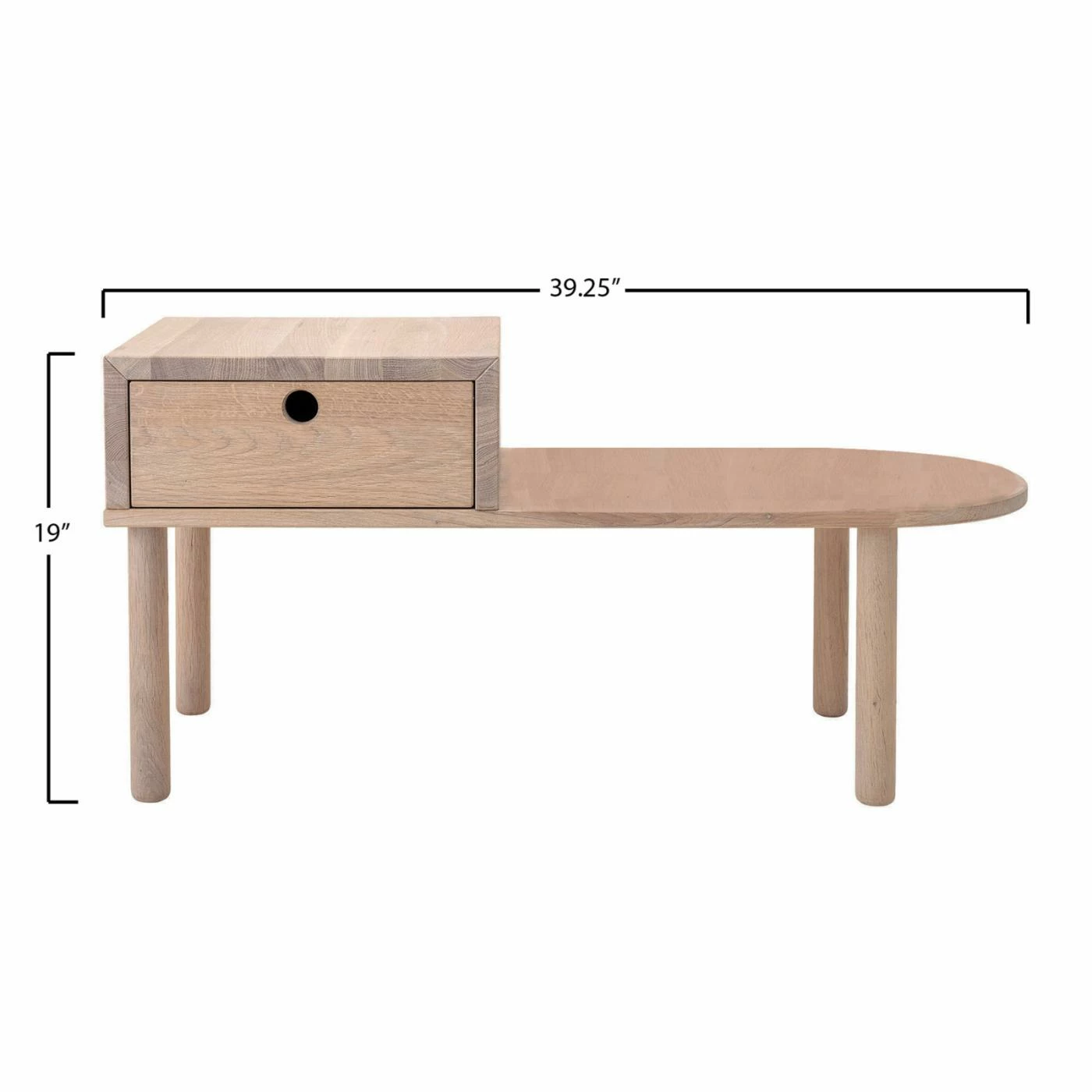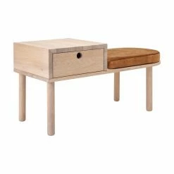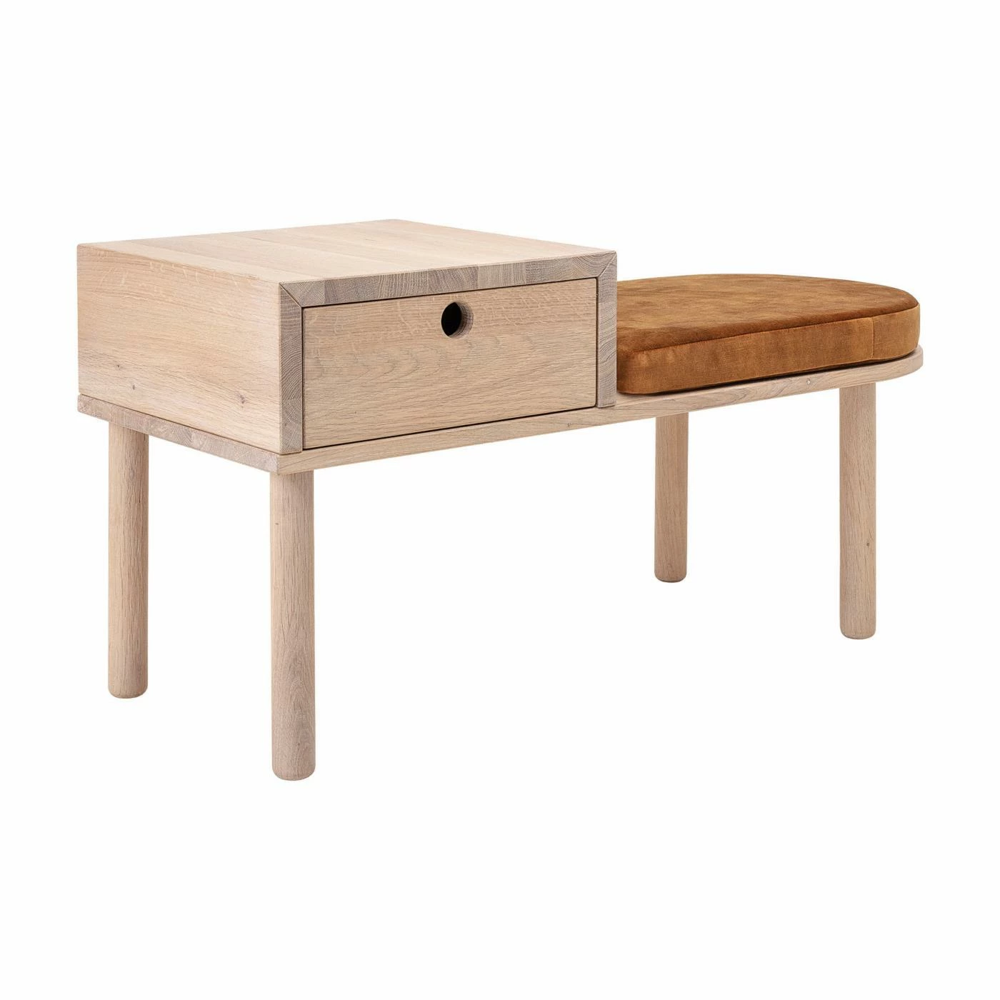 Comfort and functionality are both key pieces of the Oak Indoor Storage Bench by Sprinkle & Bloom. This wooden bench is made entirely from oak and solid wood, finished in a light, unbleached color. The round dowel legs balance out the hole in the drawer for a quaint, handmade look that goes perfectly in cottage or modern farmhouse style homes. Use the drawer for odds and ends, magazines, or your television remote. The included cushion is a rich burnt orange in a velvet like upholstery, which is an easy way to add a robust neutral to the room without compromising your sense of style. No assembly is required.