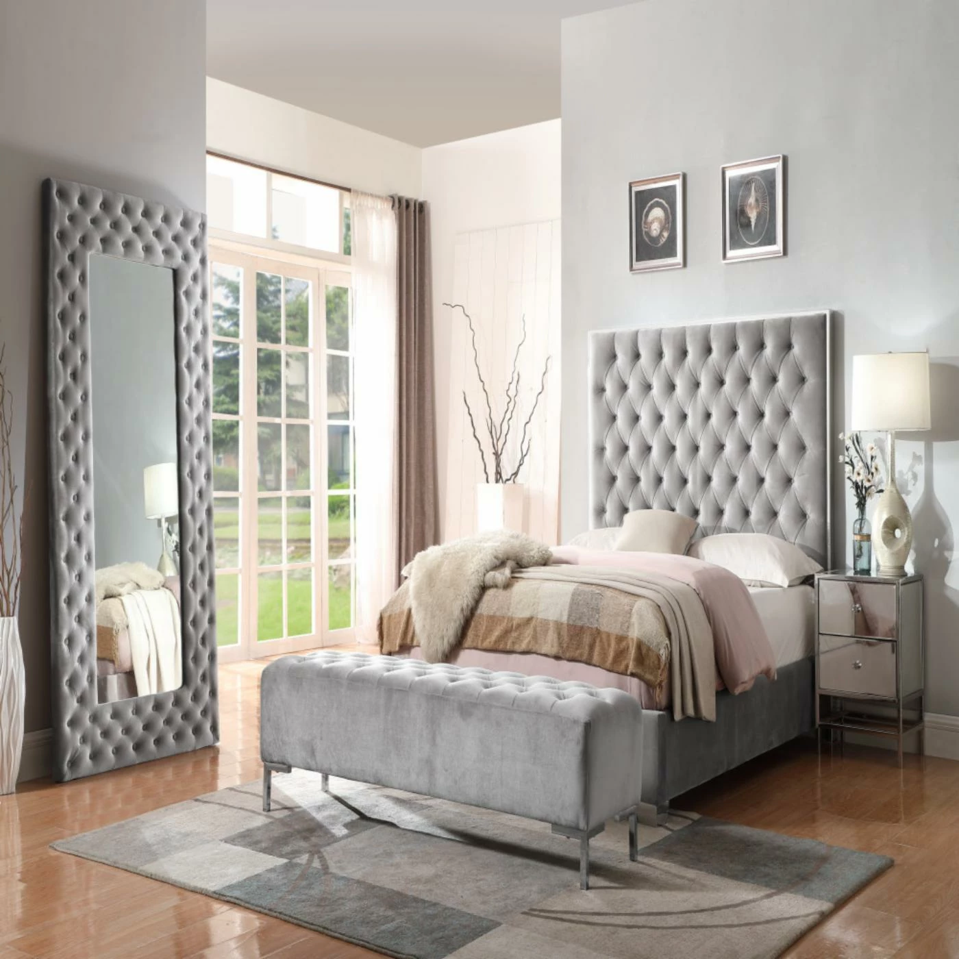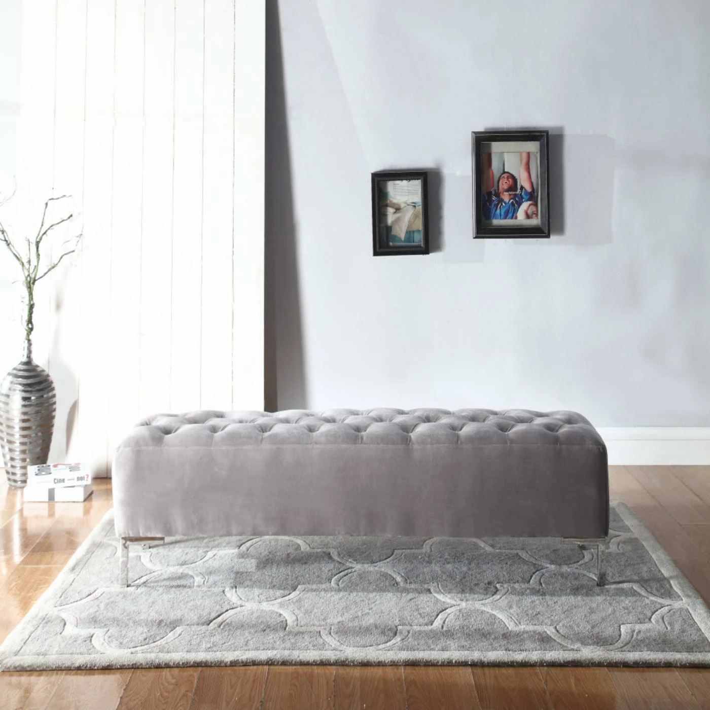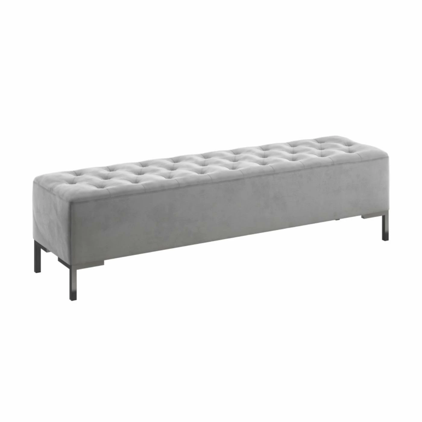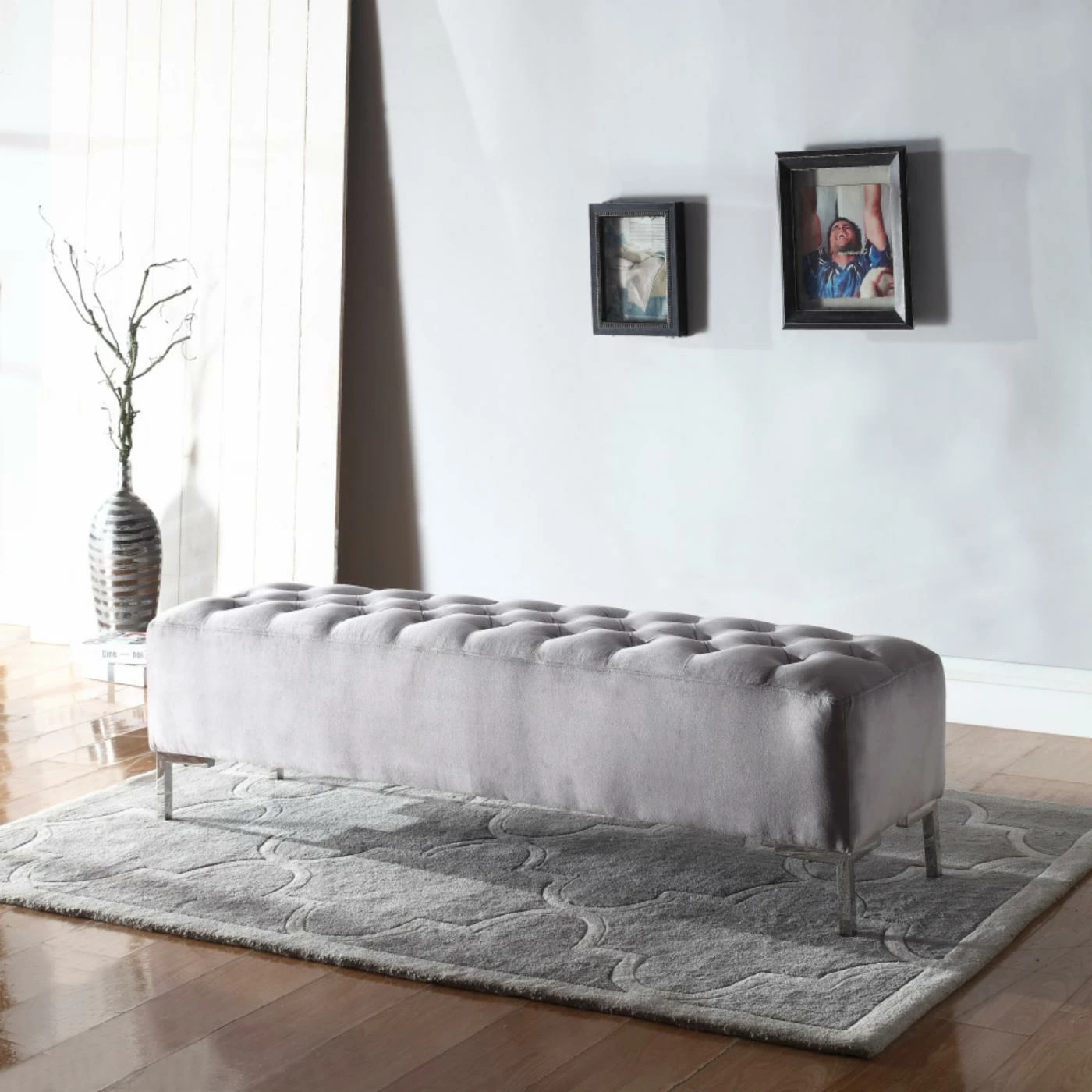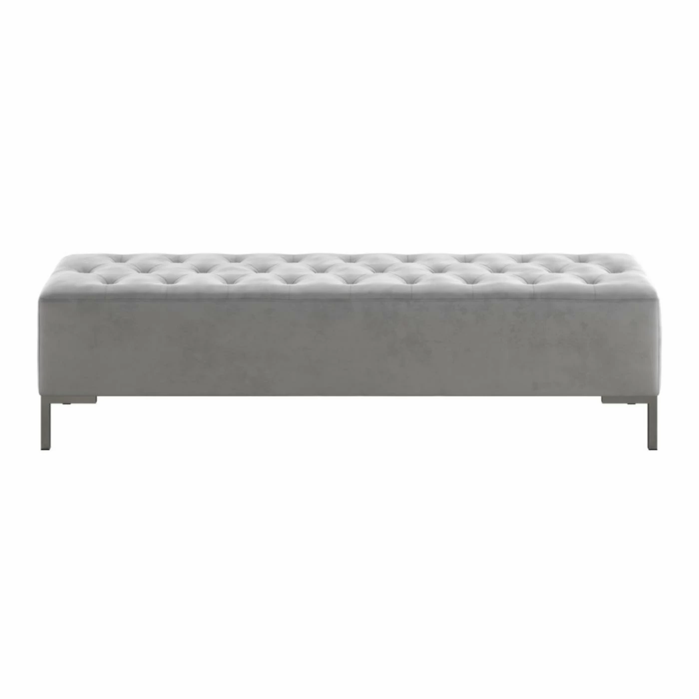 The Wallace & Bay James Upholstered Bench is a testament to the elegance of transitional design. This bench features a sleek chrome frame adorned with button-tufted faux velvet upholstery in a neutral gray hue. It makes a stylish addition to your den, living room, or bedroom, and it can be used to provide supplementary seating or as a comfortable footrest.